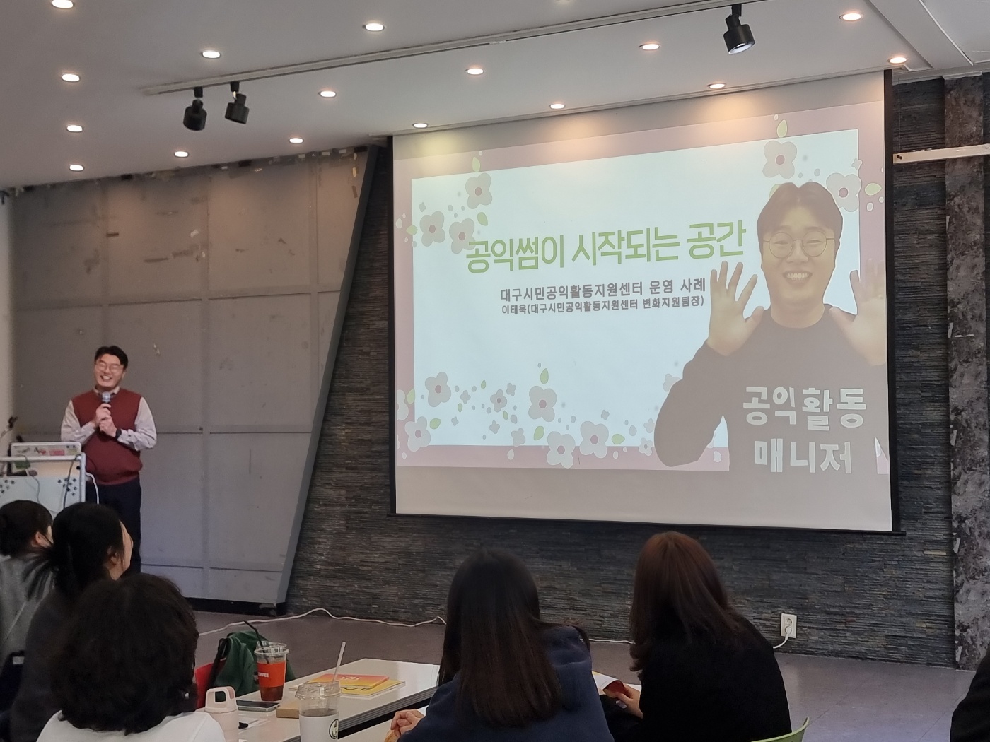 워크숍의 시작은 대구시민공익활동지원센터 변화지원팀의 이태욱 팀장님의 사례를 듣는 시간이었습니다.