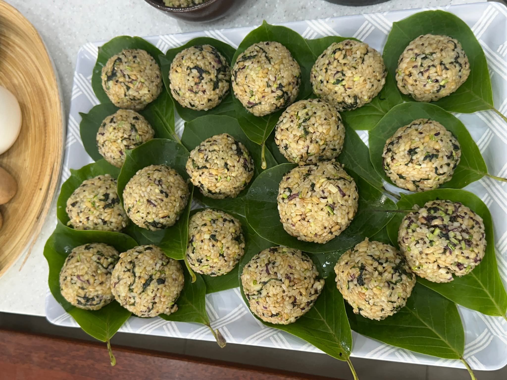 향긋한 들깨를 만나는 가을이 참 좋다. 우선 현미밥을 앉히고, 들깨를 볶고 밭에서 거둔 당근과 노란 주키니와 자색 양파를 다져서 주먹밥 재료를 준비한다. 밥이 다 되면 고소한 들깨와 소금으로 간을 하고 볶아둔 채소를 넣어 한 입 크기의 주먹밥을 동글동글 빚는다.