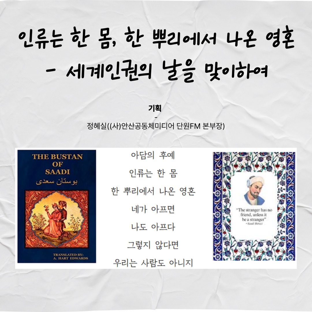 세계인권선언 1조는“모든 사람은 태어날 때부터 자유롭고, 존엄성과 권리에 있어서 평등하다”고 선언한다. 예외 없는 모든 사람이며, 모두가 존엄하고 권리는 평등한 존재가 사람이다. 그렇기 때문에 우리는 한 몸이며, 한 뿌리에서 나온 영혼이다. 타인의 고통이 곧 나의 고통이 될 수 있는 것은 선언 때문이 아니라 인류가 같은 사람이라는 존재이기 때문이다. 그래서 타인의 아픔에 공명하지 못한 채 잔인해질 수 있다면 결코 사람일 수 없다고 사디는 시를 통해 말하고 있다.