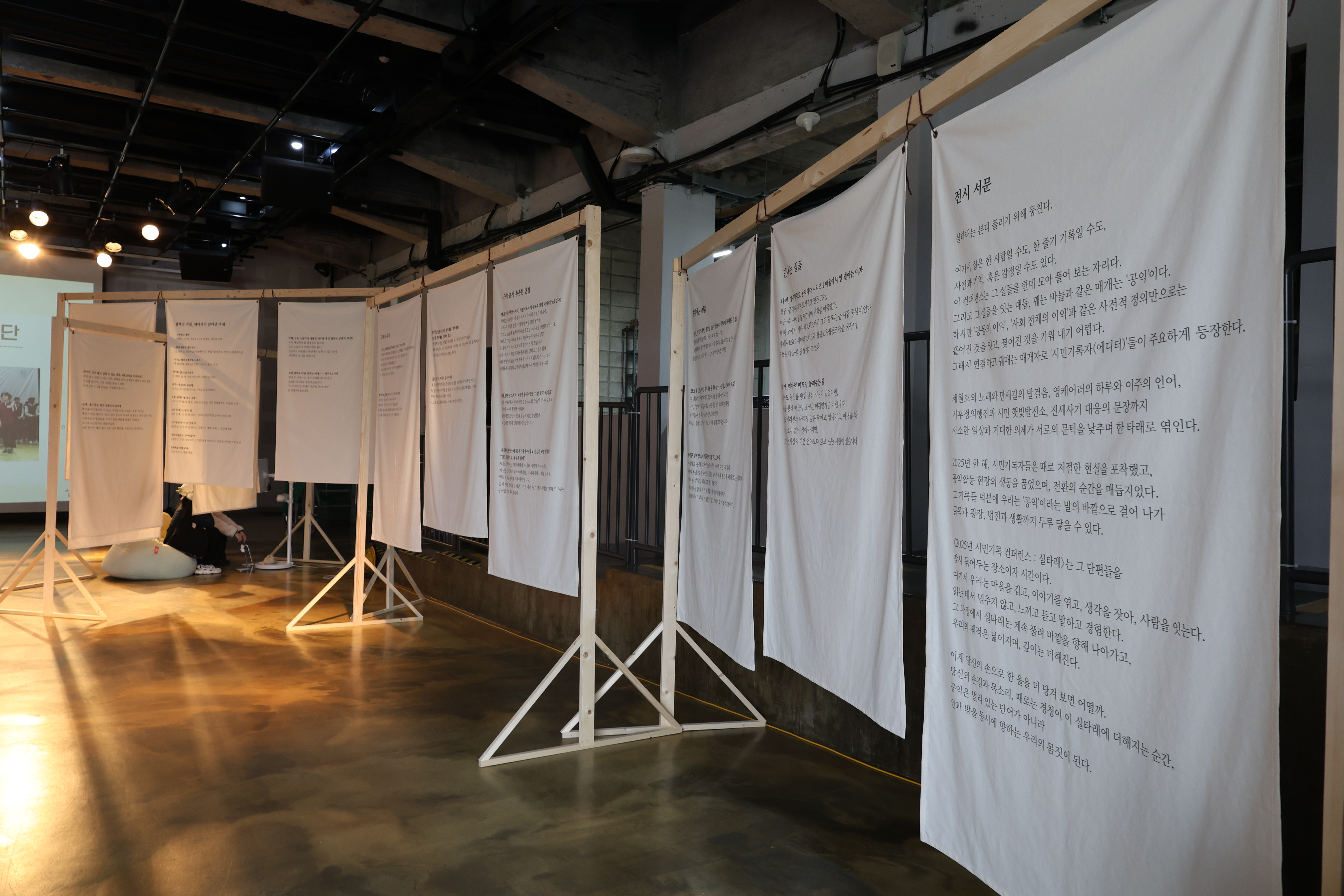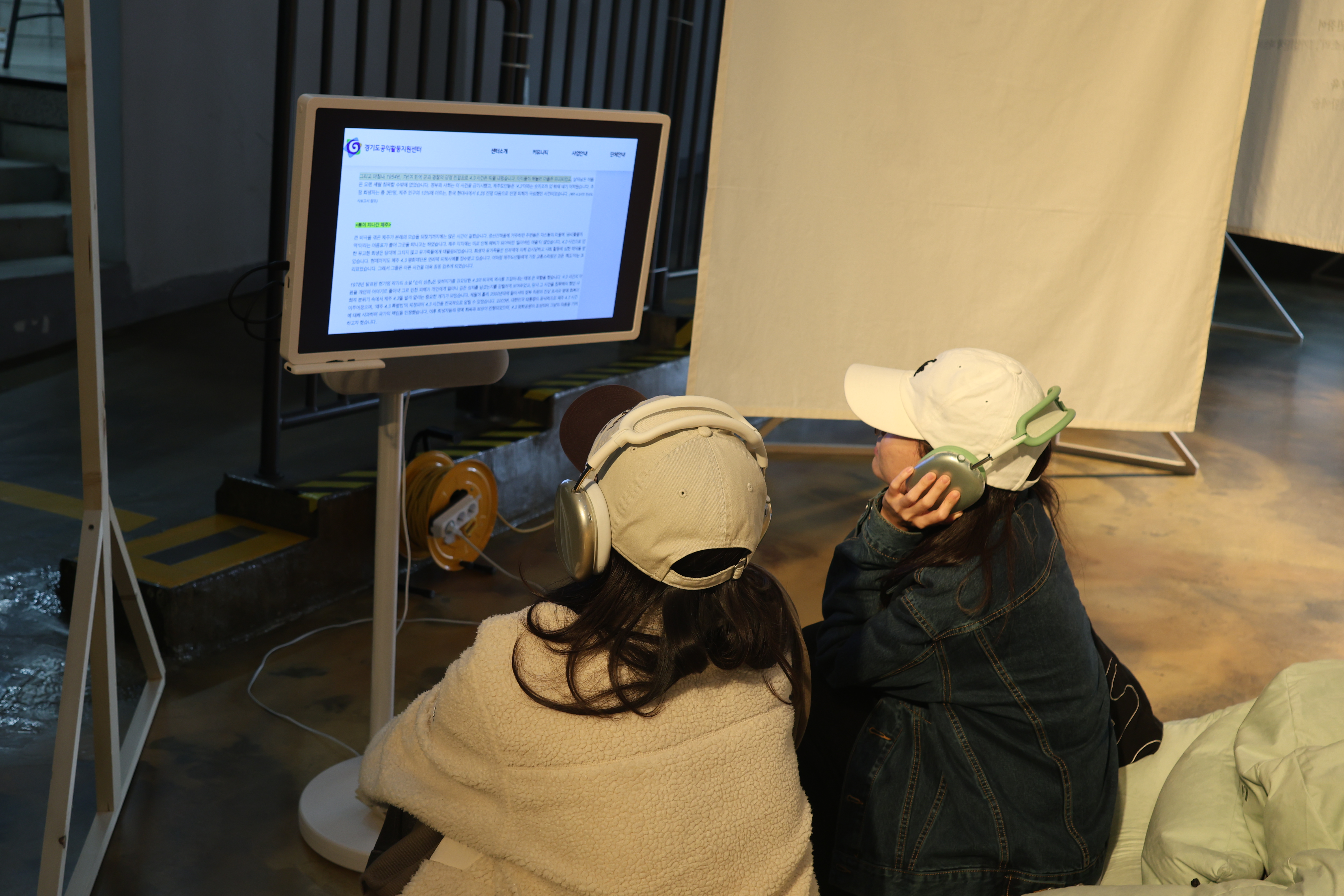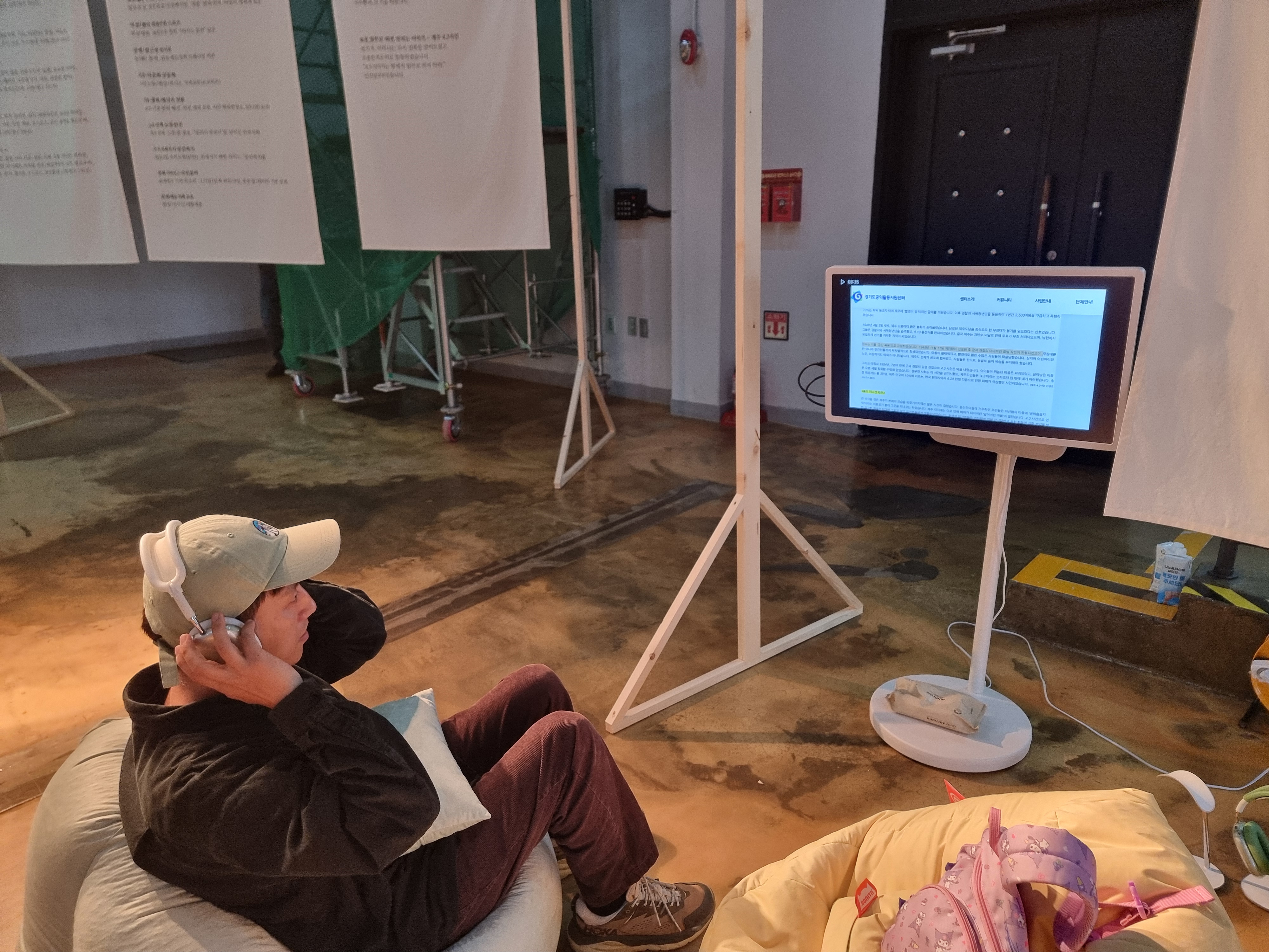 한쪽에서는 헤드셋을 착용하고 자리에 앉아 기사를 귀로 감상하고 있는 참가자들이 보였습니다. 원고를 글로만 보는 것이 아니라 에디터들의 음성으로 느껴볼 수 있는 기록 전시 방식이었습니다. ‘심지’ 에디터를 비롯한 3인의 에디터가 자신의 기록물을 직접 녹음하여 귀로 들을 수 있는 전시를 마련하였습니다.