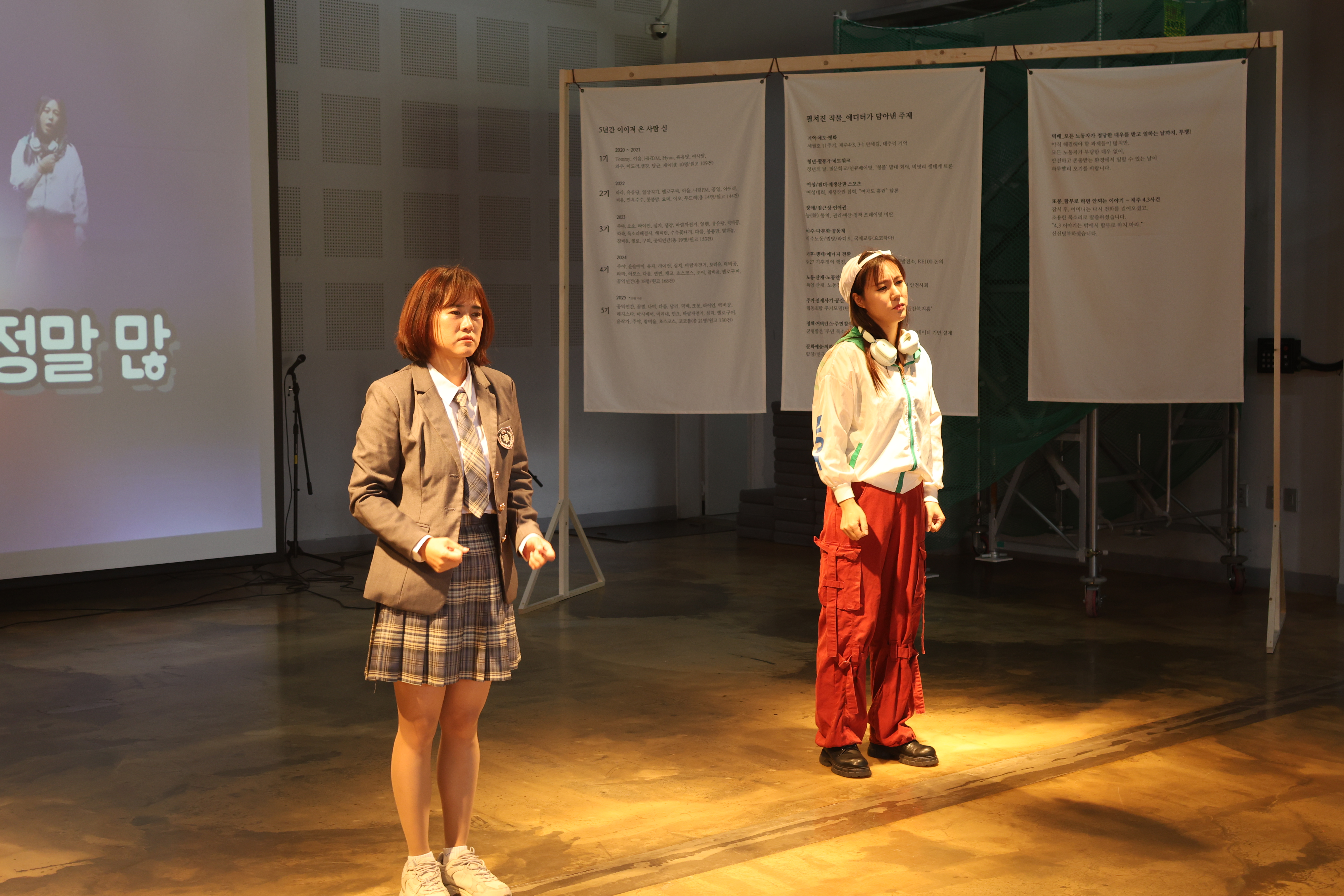 센터장님의 개회사 뒤에는 이번 컨퍼런스를 더욱 뭉클하게 만든 특별한 무대가 펼쳐졌습니다. 바로 지구인 수어 합창단의 공연이었는데요. 이들은 수어로 노래하는 팀으로, 언어의 경계를 넘어 마음으로 소통하는 감동적인 무대를 선보였습니다. 이 무대의 주인공들은 5기 에디터 윤 작가님의 글, '손으로 노래하는 지구인들' 속 주인공들이기도 했습니다. 이 공연은 노래의 새로운 정의를 깨닫게 해주었습니다. 몸과 눈으로 부르는 노래를 감상하니 이날의 자리가 더욱 따뜻하게 느껴졌습니다. 공연을 마친 후, 본격적인 토크쇼가 시작되었습니다. 토크쇼의 주인공이 될 기록 속 주인공들은 5기 에디터 두 분(윤 작가님, 꿀벌님)과 그 기록 속의 주인공 두 분(전연 단장님, 얼쑤 활동가님)이었습니다.