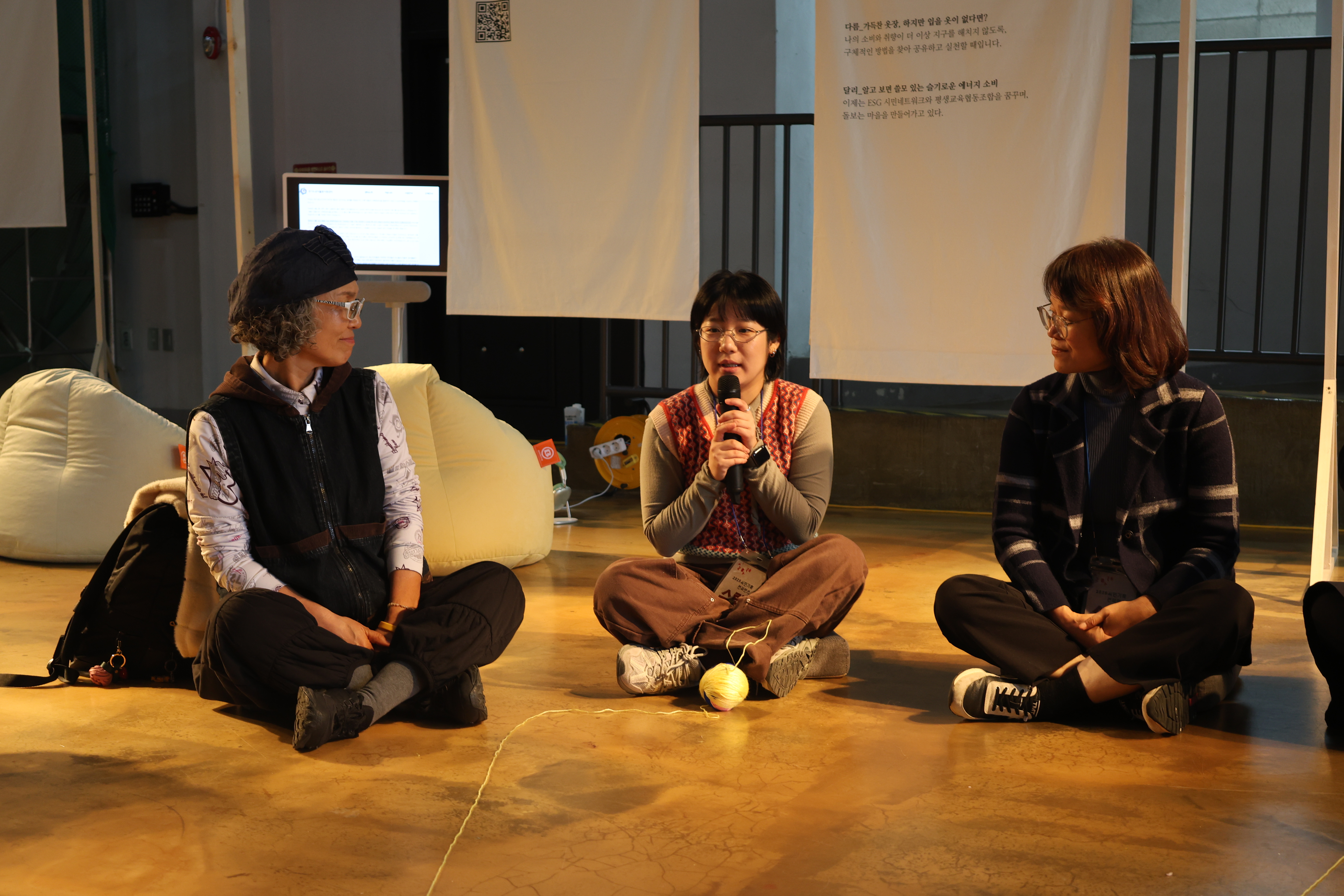 2부에서는 '지금, 우리 이야기'라는 주제로 모든 참석자가 함께하는 '실타래 엮기' 프로그램이 진행되었습니다. 사회자가 던진 실타래를 받은 사람은 자신의 기록에 대한 이야기를 나누고, 다음 이야기를 듣고 싶은 사람에게 실타래를 굴려주는 방식으로 진행되었습니다. 물리적인 실타래가 얽히면서 참가자들의 이야기와 마음도 함께 연결되는 시간이었습니다. 행사의 주요 키워드인 ‘실타래’를 통해 행사의 의미를 살려낸다는 것이 매우 인상적이었습니다.