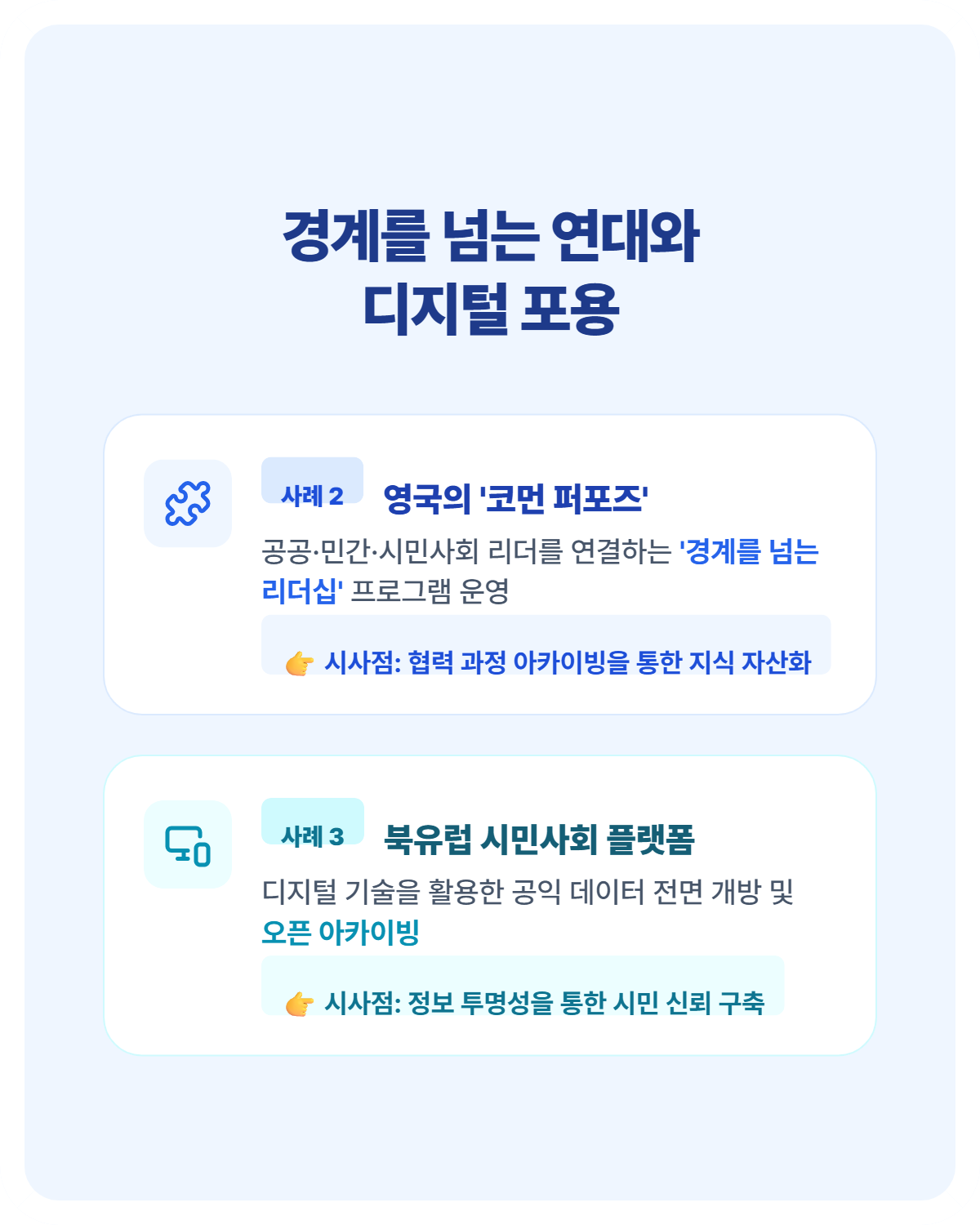 코먼 퍼포즈 활동에서 주목할 점은 협력의 모든 과정을 치밀하게 기록하고 공유한다는 점입니다. 이들은 서로 다른 이해관계자들이 갈등을 조정하고 사회적 합의에 이르는 모든 서사(Narrative)를 아카이빙하여 대중에 공개합니다. 이러한 기록 방식은 다른 지역 사회나 단체들이 유사한 문제를 겪을 때 시행착오를 획기적으로 줄여주는 ‘지식 자산(Knowledge Asset)’으로 활용됩니다.