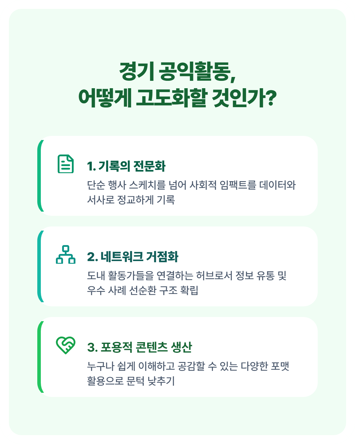 첫째, 기록의 전문성과 서사적 가치 부여입니다. 단순한 행사 스케치를 넘어, 공익활동이 창출하는 사회적 임팩트를 정교한 논리와 감동적인 서사로 담아내는 전문적인 아카이빙이 필요합니다. 둘째, 네트워크의 거점화 및 지식 공유의 활성화입니다. 에디터는 도내 활동가들을 연결하는 허브로서, 지역 간의 우수 사례가 선순환될 수 있도록 정보를 유통하는 역할을 강화해야 합니다. 셋째, 포용적 참여를 이끄는 다각적 콘텐츠 생산입니다. 텍스트 위주의 원고뿐만 아니라 인포그래픽, 카드뉴스 등 도민들이 쉽게 이해하고 공감할 수 있는 다양한 포맷을 활용하여 공익활동의 문턱을 낮춰야 합니다.