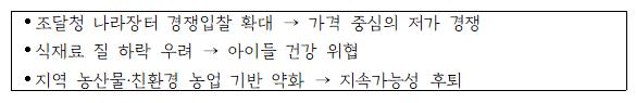 겉으로는 투명성과 효율성을 내세우지만, 실제로는 가격 중심의 저가 경쟁을 유도하는 구조입니다. 저가 입찰은 필연적으로 식재료의 질을 떨어뜨립니다. 지금까지 지켜온 ‘안전성·친환경성·공공성’은 뒷전으로 밀려나고, 대형 유통업체난 수입농산물이 학교 급식 시장을 잠식할 우려가 큽니다. 결국 아이들의 건강이 위험에 처할 수 있습니다. 더구나 학교급식을 통해 유지되던 지역 농산물과 친환경 농업 생산 기반도 약화 될 가능성이 커져서 지속가능성이 후퇴될 것입니다.