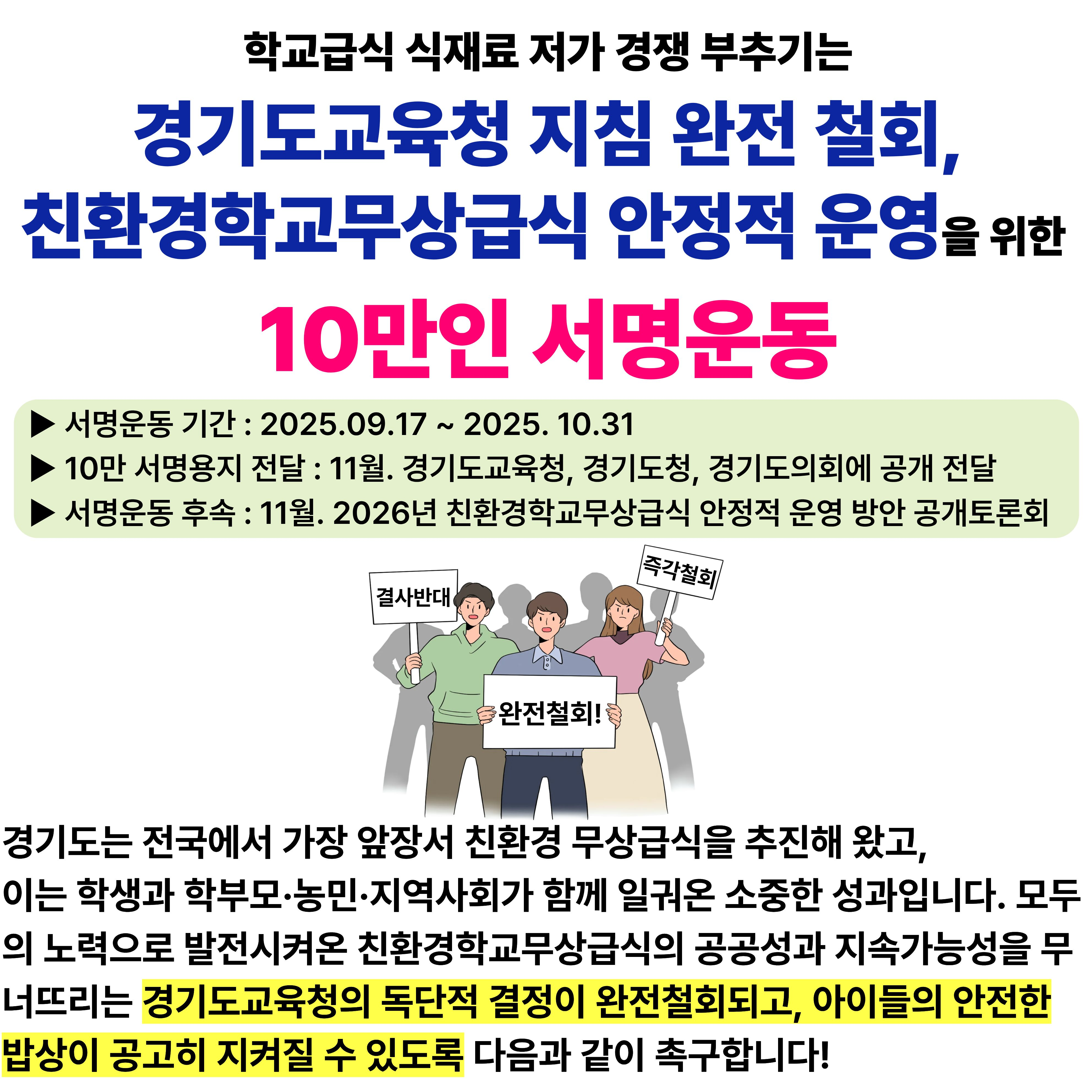 10월 31일까지 ‘학교급식 식재료 저가 경쟁 부추기는 경기도교육청 지침 완전 철회, 친환경무상학교급식 안정적 운영을 위한 10만인 서명운동’을 진행하고 11월 서명 결과를 모아 경기도교육청과 관계기관에 전달할 예정입니다.