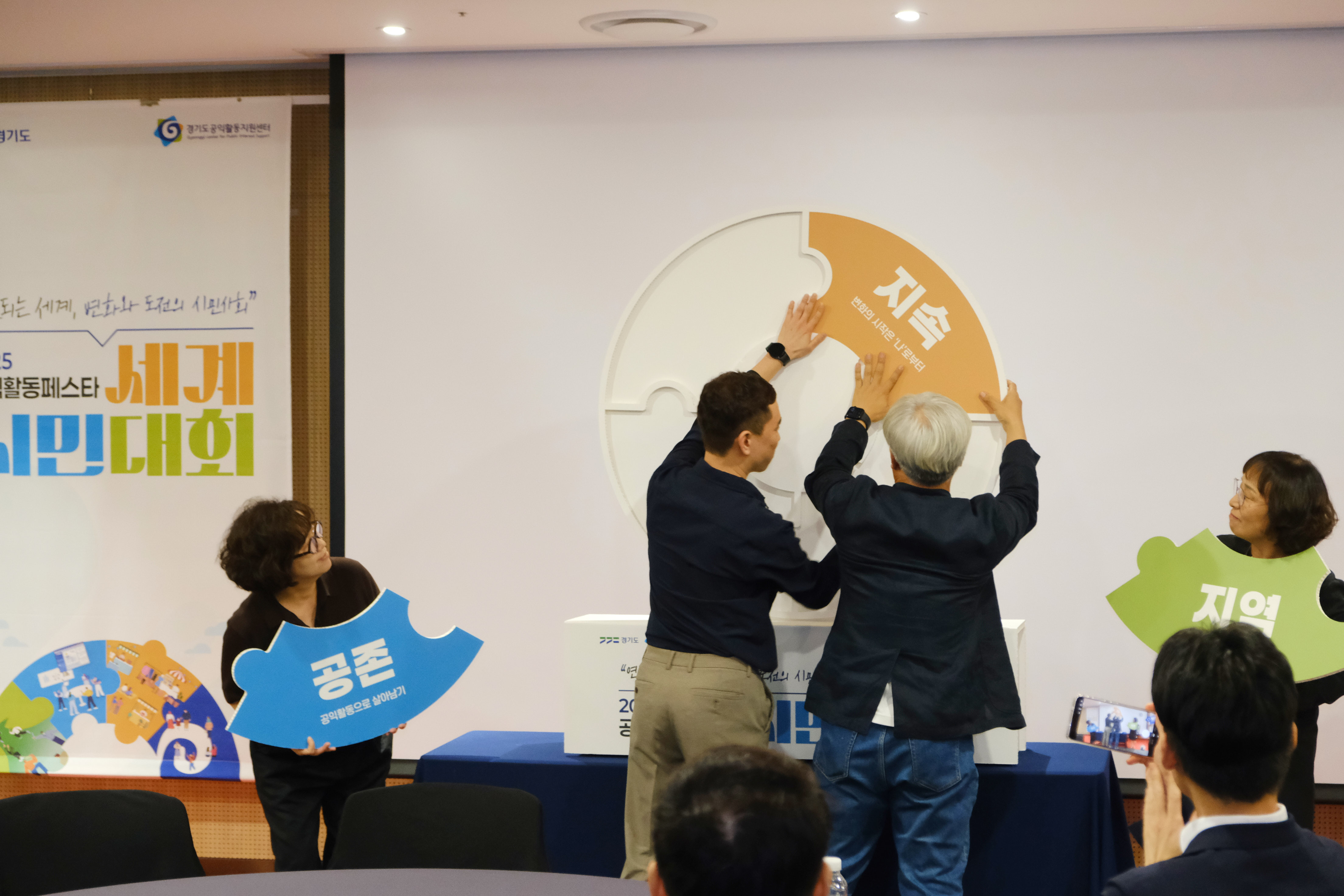 마지막 순서는 네 개의 핵심 키워드를 대표자들이 하나씩 들고 사회자의 안내에 따라 무대 앞 퍼즐판에 맞추는 세레모니였는데요. 모두의 박수 속에 이번 세계시민대회의 정신이 “지속, 공존, 지역, 연결”로 둥글게 완성되었습니다. 퍼즐이 맞춰지는 순간, 각자의 자리에서 이어온 공익활동이 다시 서로를 만나 하나로 연결되는 느낌이 현장 전체를 따뜻하게 감쌌습니다. 그렇게 2025 세계시민페스타는 서로의 이야기가 모여 만들어낸 울림 속에서, 다음 만남을 기약하며 막을 내렸습니다.