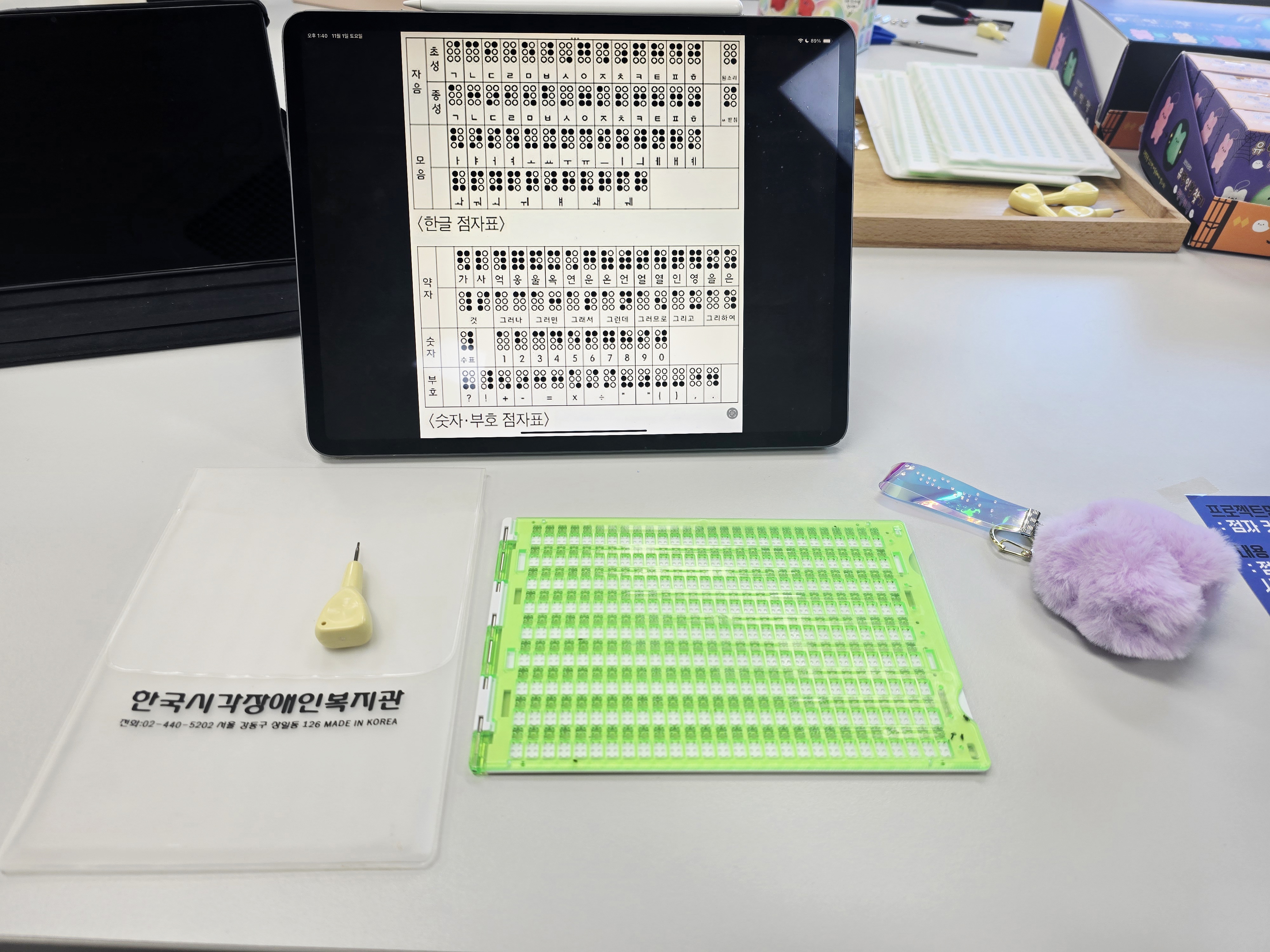 그중에서도 단연 돋보였던 부스는 ‘손으로 그리는 세상’ 팀의 점자 키링 체험이었습니다. 귀여운 솜털 키링과 반짝이는 홀로그램 리본에, 참가자들이 점자 도구로 정성스럽게 새긴 문구가 더해져 시각장애인 인식 개선에 한 발짝 가까이 다가가는 체험 기회가 제공되었습니다. 가장 먼저 눈에 띈 것은 파스텔 톤의 키링과 다양한 색상의 리본, 그 위에 올려진 점자판·점필·한글 점자 표로 구성된 체험 키트였습니다. 시각적 즐거움과 함께 호기심도 자극했죠. 현장에서 제공된 랜덤 키링 상자를 여는 듯한 재미도 더해졌습니다.
