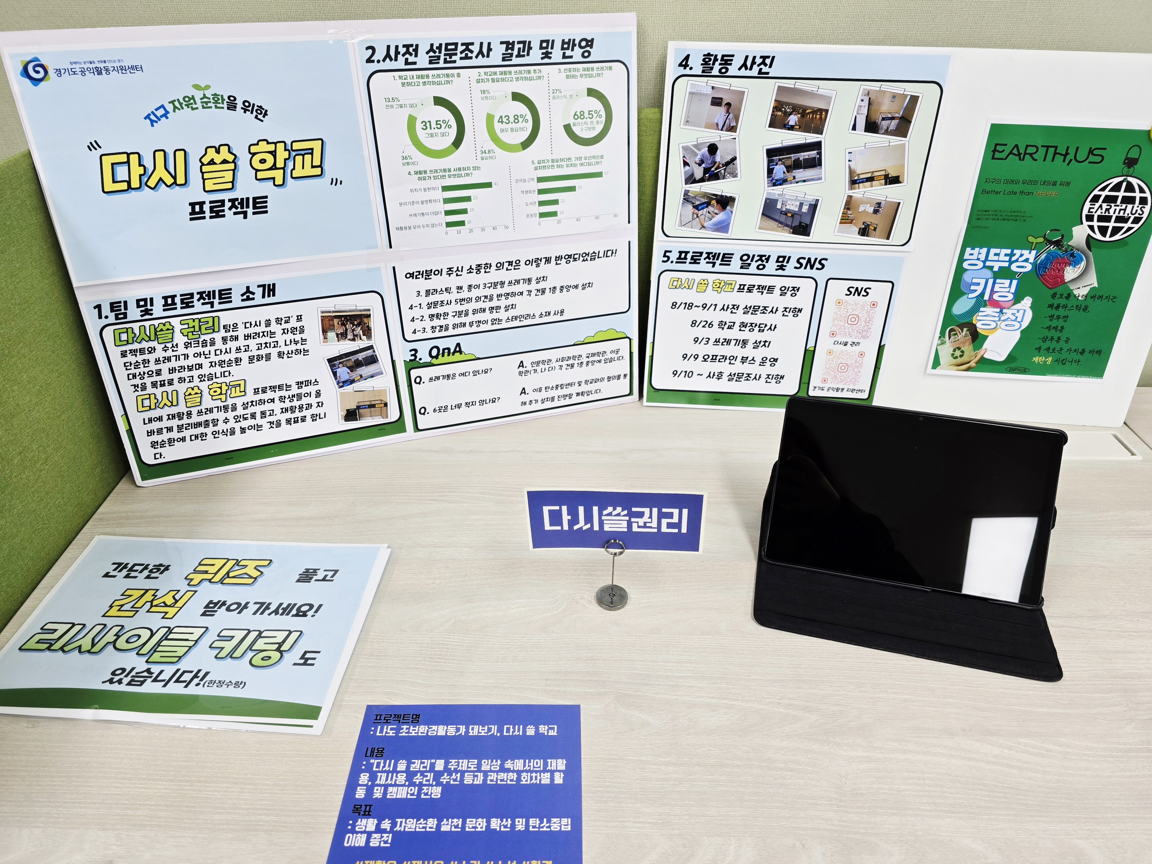 전시: 설문조사 결과, 활동사진, SNS 운영 사례 등이 체계적으로 정리되어 있었으며, 퀴즈 이벤트와 경품도 준비되어 현장에서 많은 참여를 이끌어냈습니다.