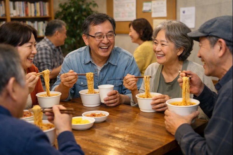 ▶1인 가구 중·장년 사람들끼리 라면 식사와 함께 교류하는 모습 / 출처: AI 생성 이미지