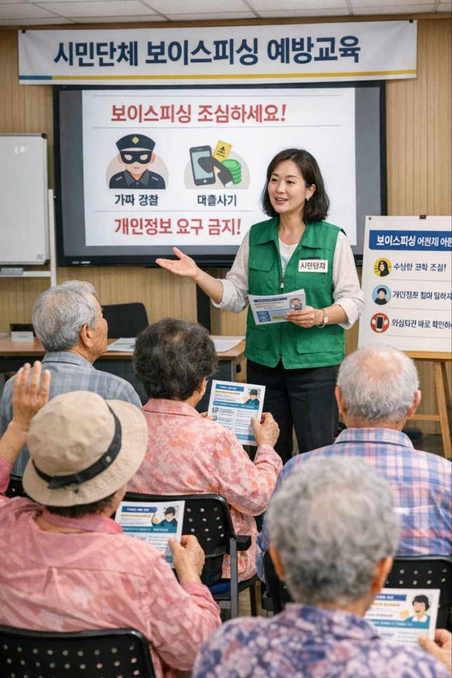▶시민단체의 어르신 대상 보이스 피싱 예방 교육이 진행되는 모습 / 출처: AI 생성 이미지