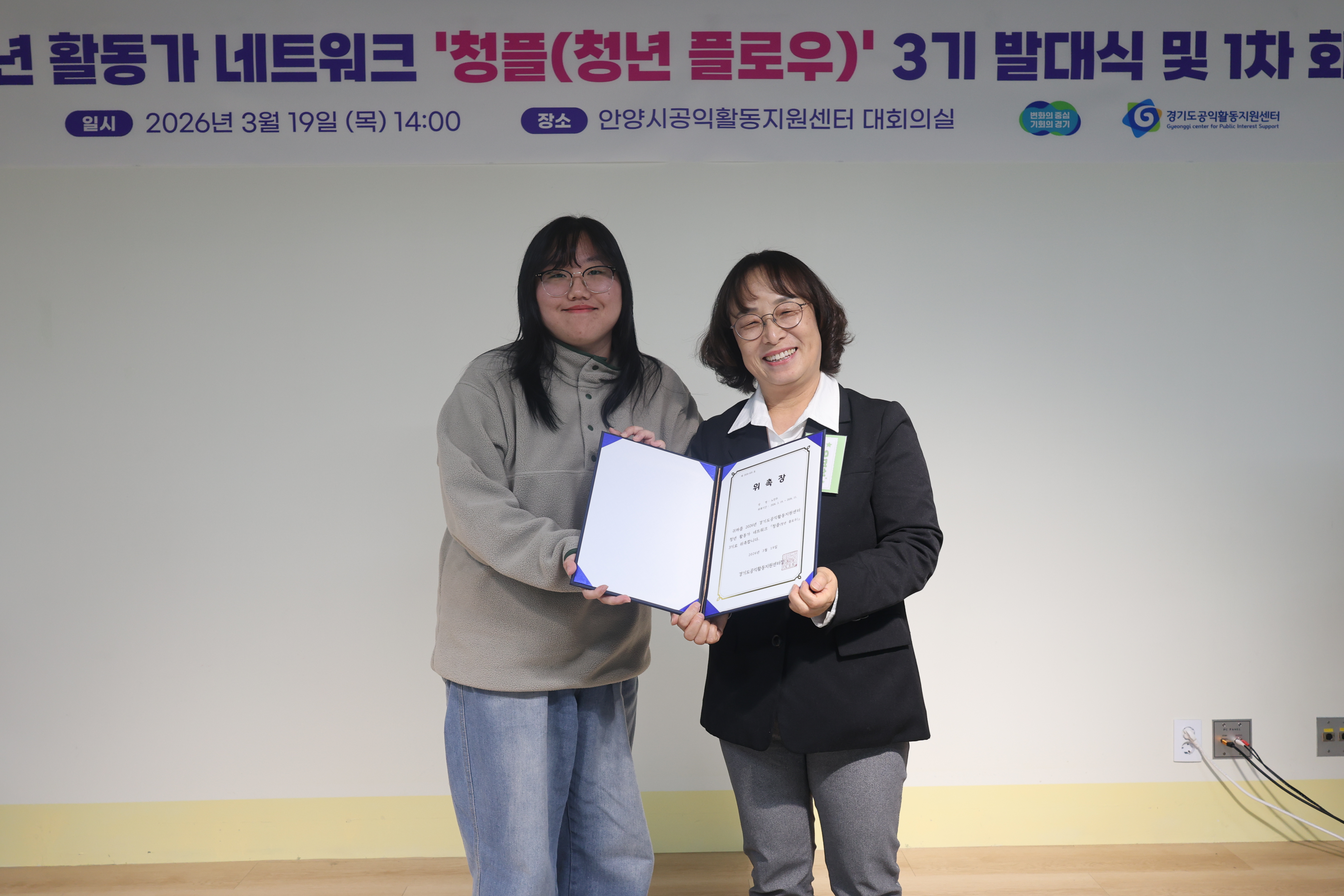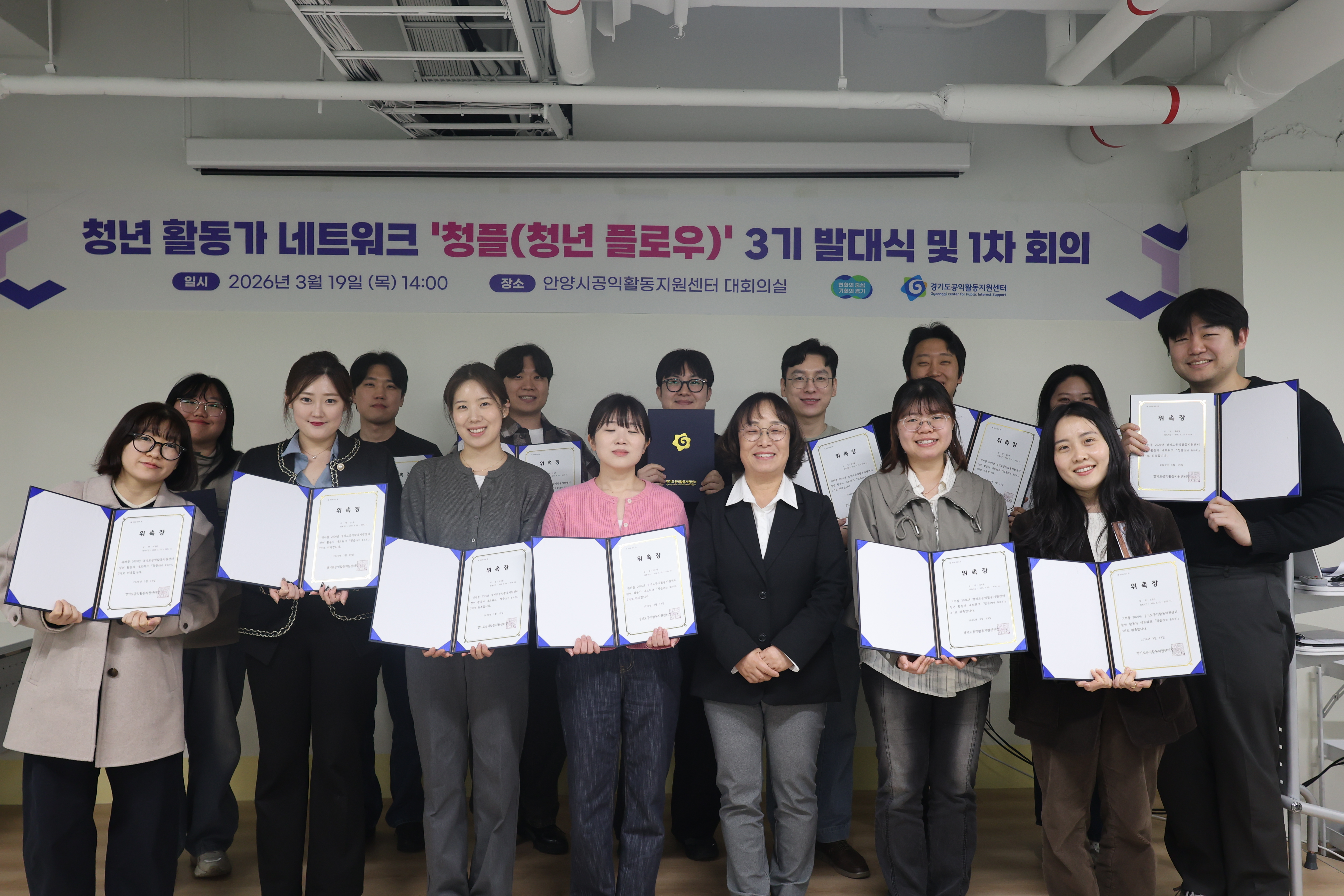 2026년 3월 19일, 안양시공익활동지원센터 대회의실에서 청년 활동가 네트워크 ‘청플(청년 플로우)’ 3기 발대식과 1차 회의가 열렸습니다. 이날 자리는 청년 활동가 15명이 처음으로 한자리에 모여 서로를 소개하고, 앞으로 어떤 흐름을 함께 만들어갈지 이야기해 보는 시간이었습니다. 가장 먼저 청플 3기를 환영하는 유명화 경기도공익활동지원센터장의 환영사가 있었습니다.