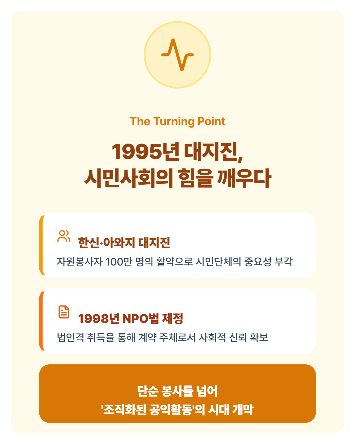 이 때문에 1995년은 일본에서 '자원봉사 원년'으로 불린다. 수십만 명의 시민이 자발적으로 움직이는 것을 보고 일본 사회는 처음으로 시민사회의 힘을 실감했다. 그리고 동시에 한계도 드러났다. 자원봉사자들의 열의는 넘쳤지만 이들을 조직하고 연결할 구조가 없었다는 점이다. 자원은 넘치는데 배분이 안 되고, 현장마다 중복 지원이 발생하는가 하면 사각지대가 생기기도 했다. 시민의 힘을 제대로 발휘하려면 그것을 뒷받침할 제도적 기반이 필요하다는 인식이 사회 전반에 퍼졌다.