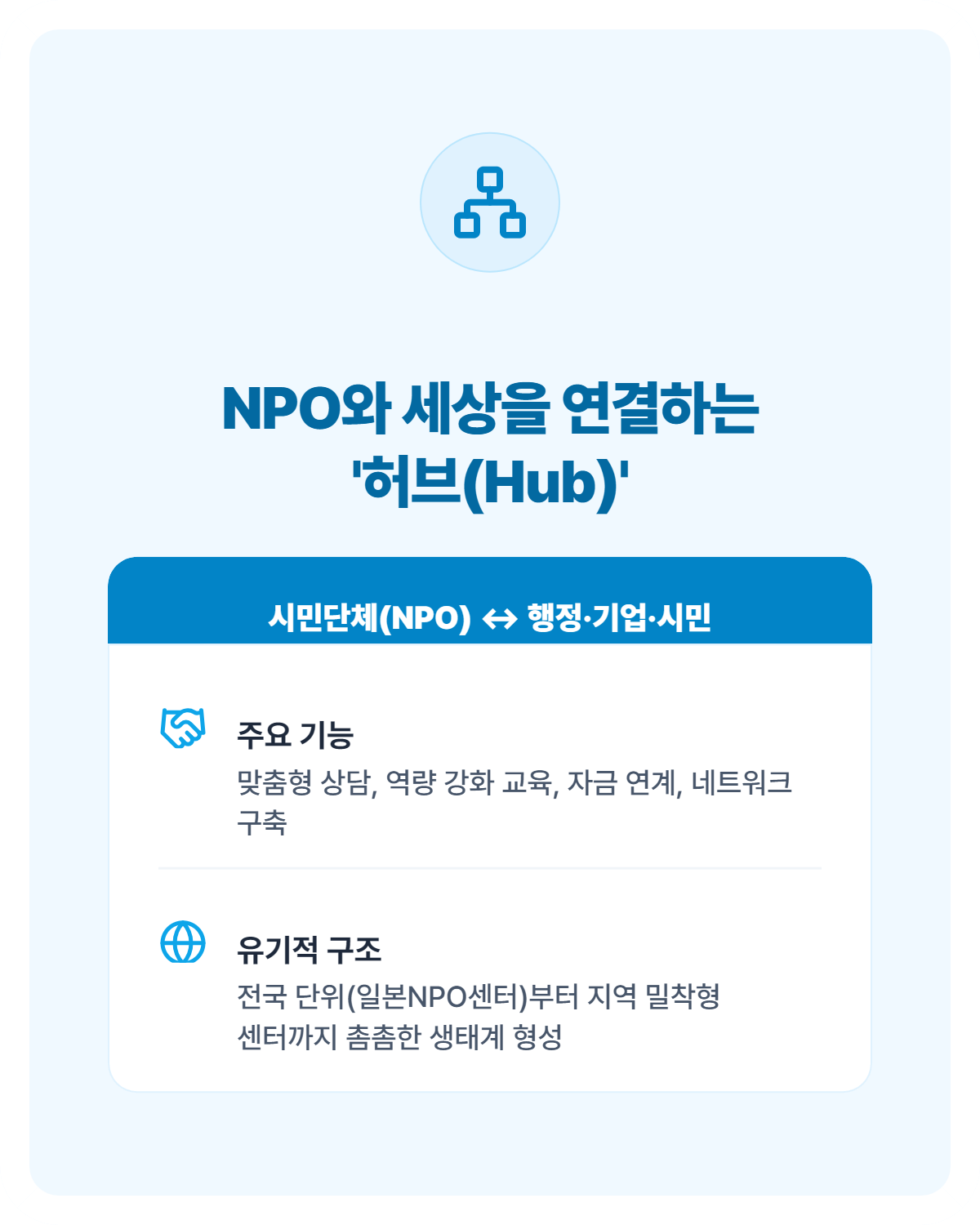 일본의 NPO 중간지원조직 생태계와 국내 중간지원조직 생태계를 비교하면 역사의 차이가 느껴지는 것은 사실이다. 1995년 대지진을 계기로 자원봉사의 원년을 선언하고, 1998년 NPO법을 제정하고, 그 위에서 30년에 걸쳐 촘촘한 지원 구조를 쌓아온 일본과, 공익활동의 제도화가 상대적으로 늦게 시작된 한국의 차이는 단순히 따라잡는다고 해결될 문제는 아니다.