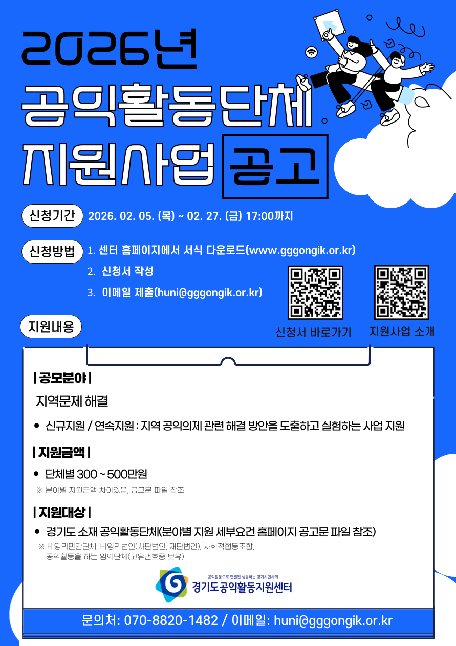 경기도공익활동지원센터는 공익활동단체의 자율적, 협력적 활동을 위한 맞춤형 사업을 지원하는 2026년 「공익활동단체 지원사업」