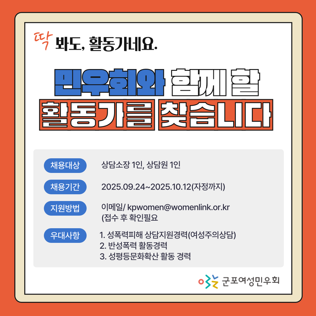 군포여성민우회성폭력상담소 활동가를 다음과 같이 공개채용 하오니 전문성과 경력을 갖춘 분들의 많은 관심과 지원 바랍니다.