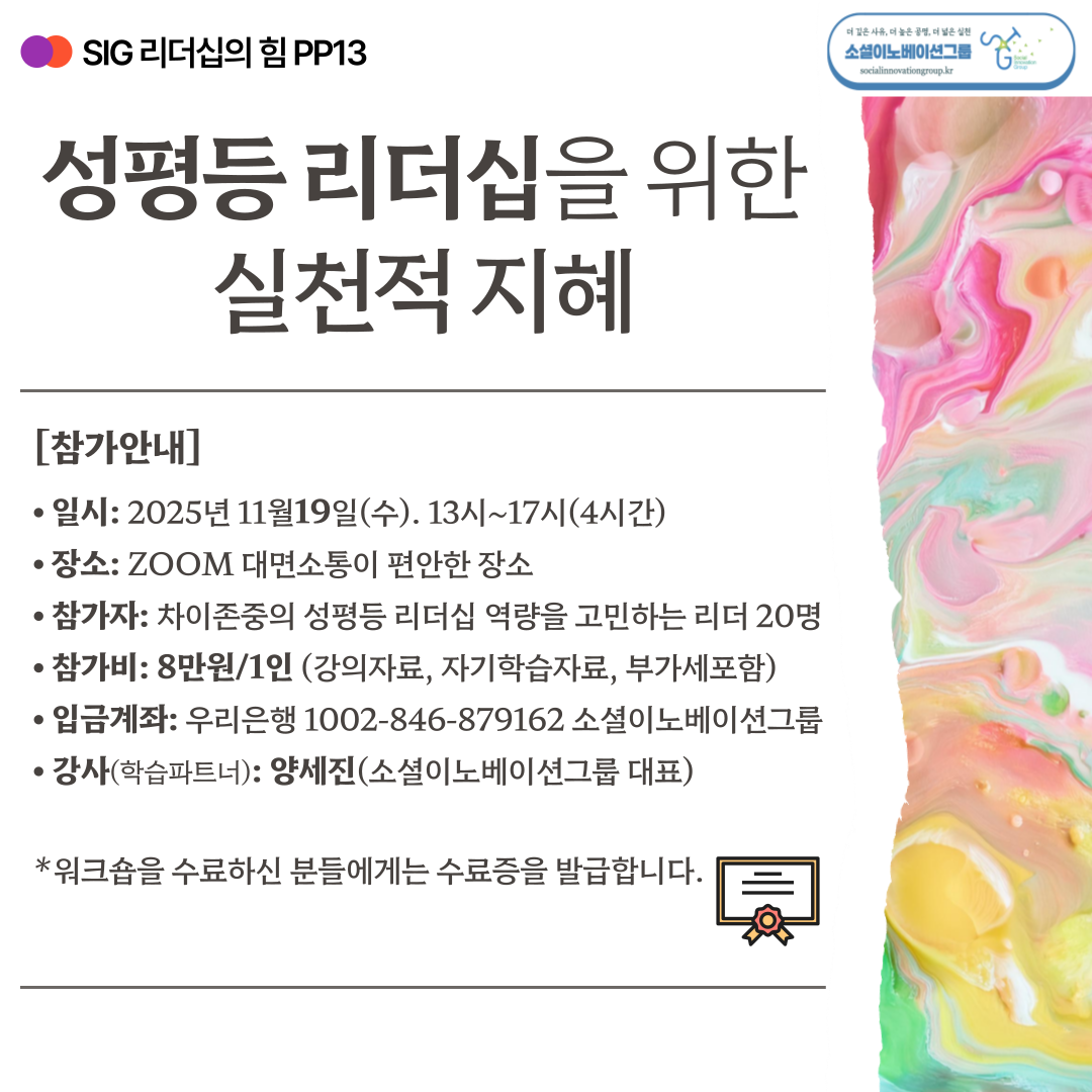 모두의 평등을 존중하는 ‘평평한 존재론, 상호얽힘, 공동생성’의 시대에 성평등 리더십을 강화하기 위한 실천적 지혜를 내면화하는 학습의 장에 성평등 리더 여러분을 초대합니다.