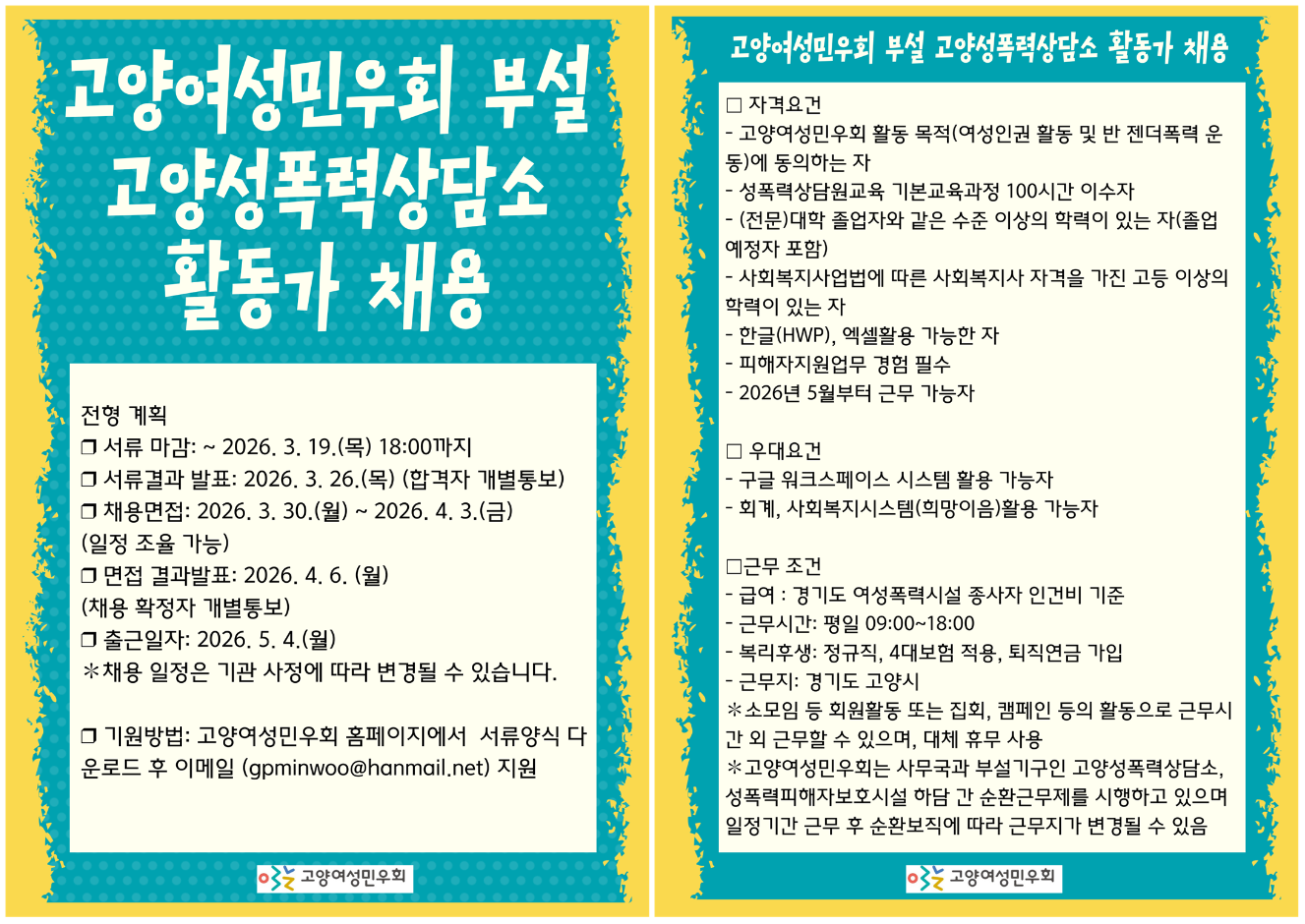 서류는 '2026고양여성민우회_상담소응시원서_이름'의 파일명으로 제출