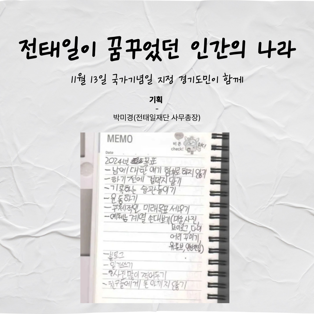 전태일의 죽음이 20세기 한국 사회가 노동 존중 사회로 거듭나는 출발점이었다면, 국가기념일 지정은 노동 선진국으로 나아가는 이정표가 될 것입니다. 경기도민과 함께 전태일이 이루지 못한 덩이를 굴려, 목적지에 닿을 수 있기를 바랍니다.