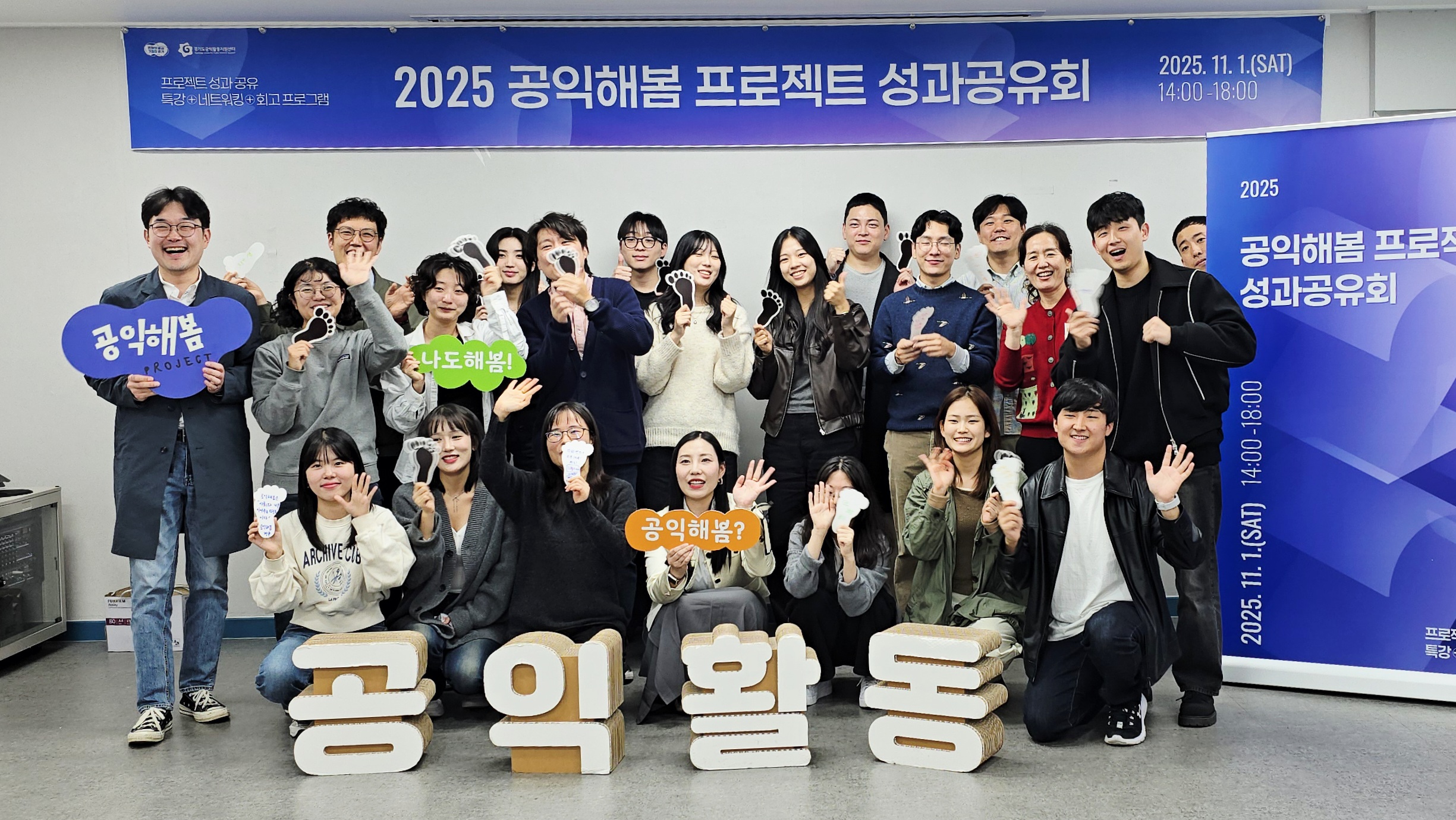 마지막으로, 참가자들은 ‘공익해봄 프로젝트’ 현수막 아래 모여 기념사진을 촬영하며 성과공유회의 의미를 되새겼습니다. 활짝 웃는 얼굴과 손에는 ‘공익해봄’, ‘나도 해봄’, ‘공익활동’ 등의 문구가 들려 있었고, 그 손끝에서 시작된 작은 실천이 오늘보다 나은 내일을 만들어갈 것이라는 믿음을 함께 전했습니다.
