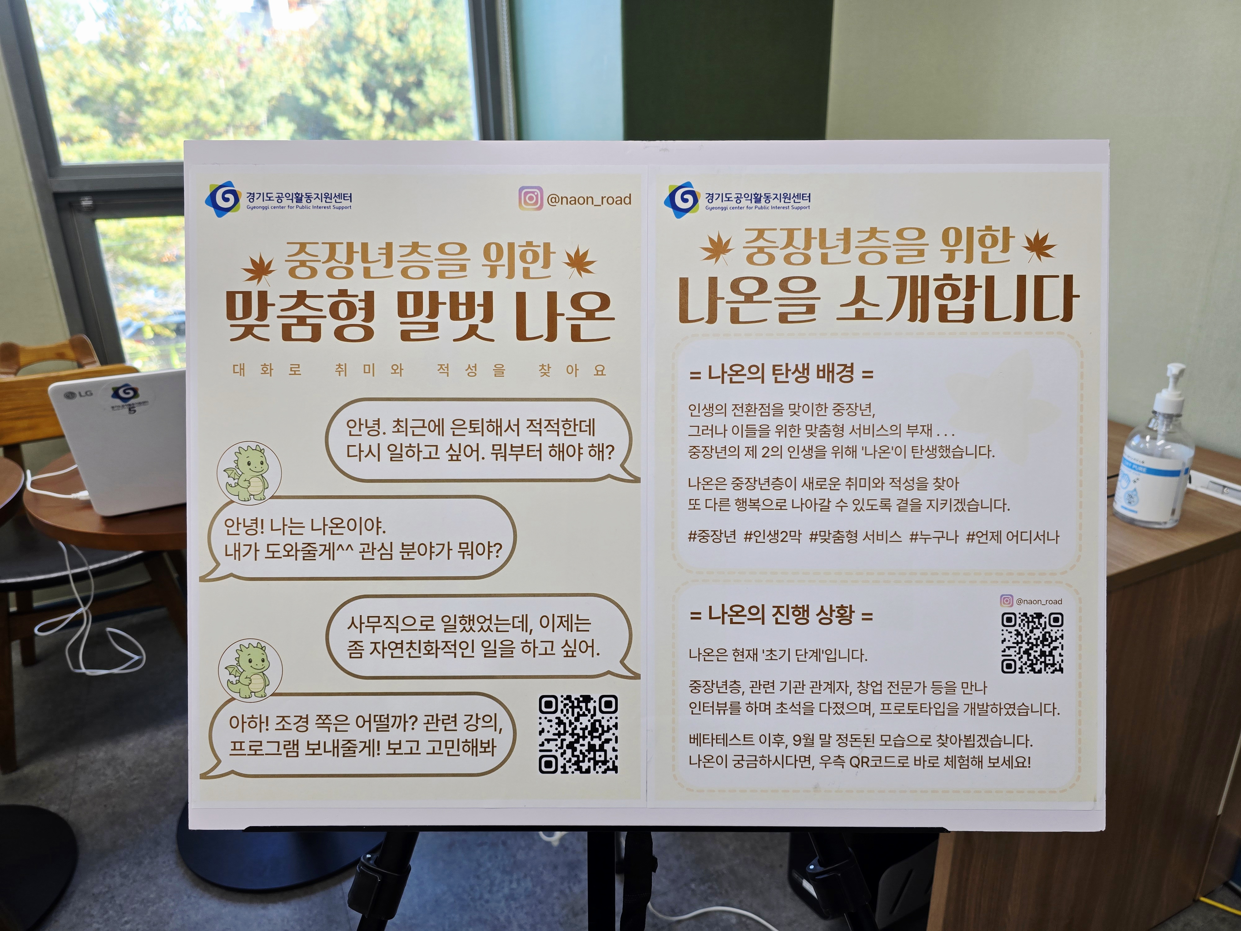 포인트:‘나온이’라는 친근한 캐릭터와 QR 기반 인터페이스를 통해 직접 서비스를 체험해 볼 수 있었으며, 실제 상담 사례도 직관적으로 소개되어 이해를 도왔습니다.