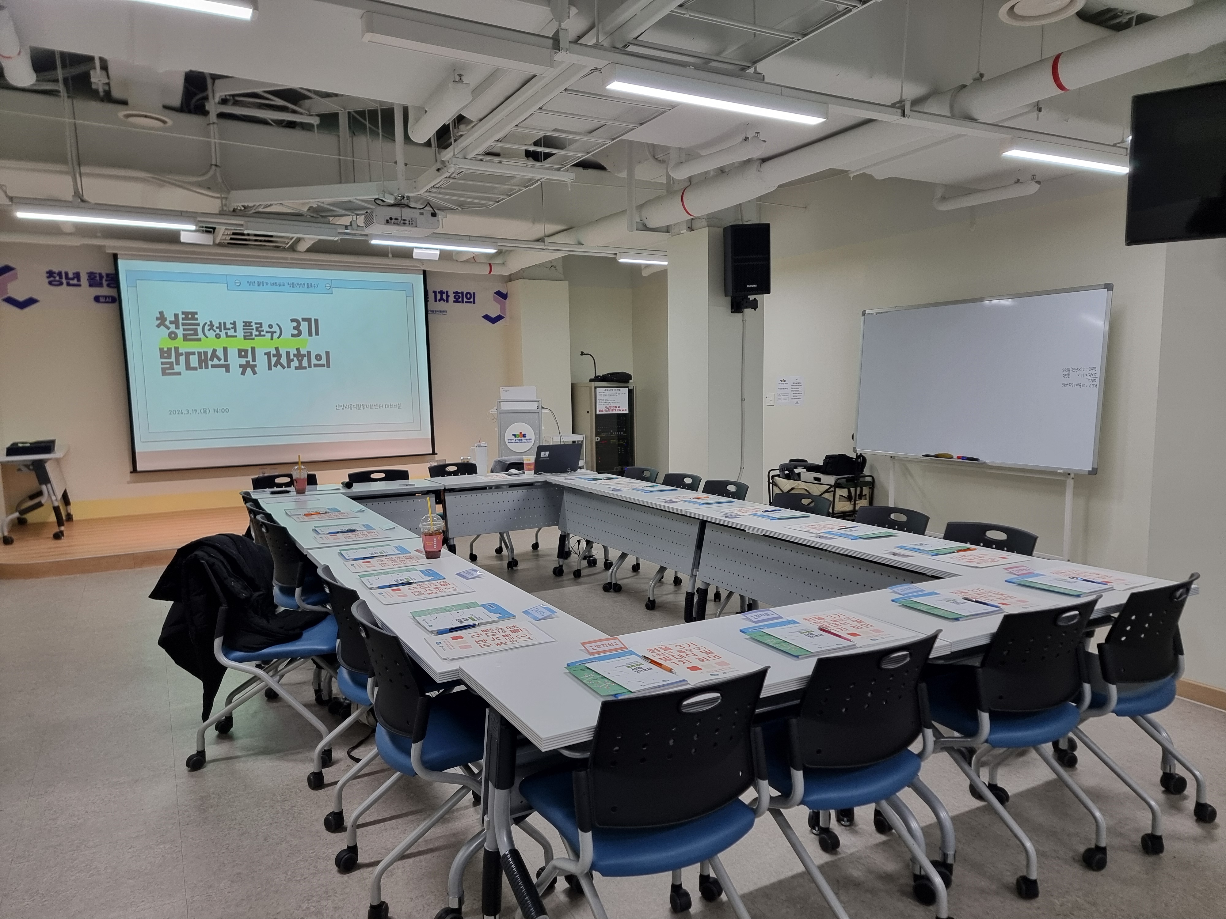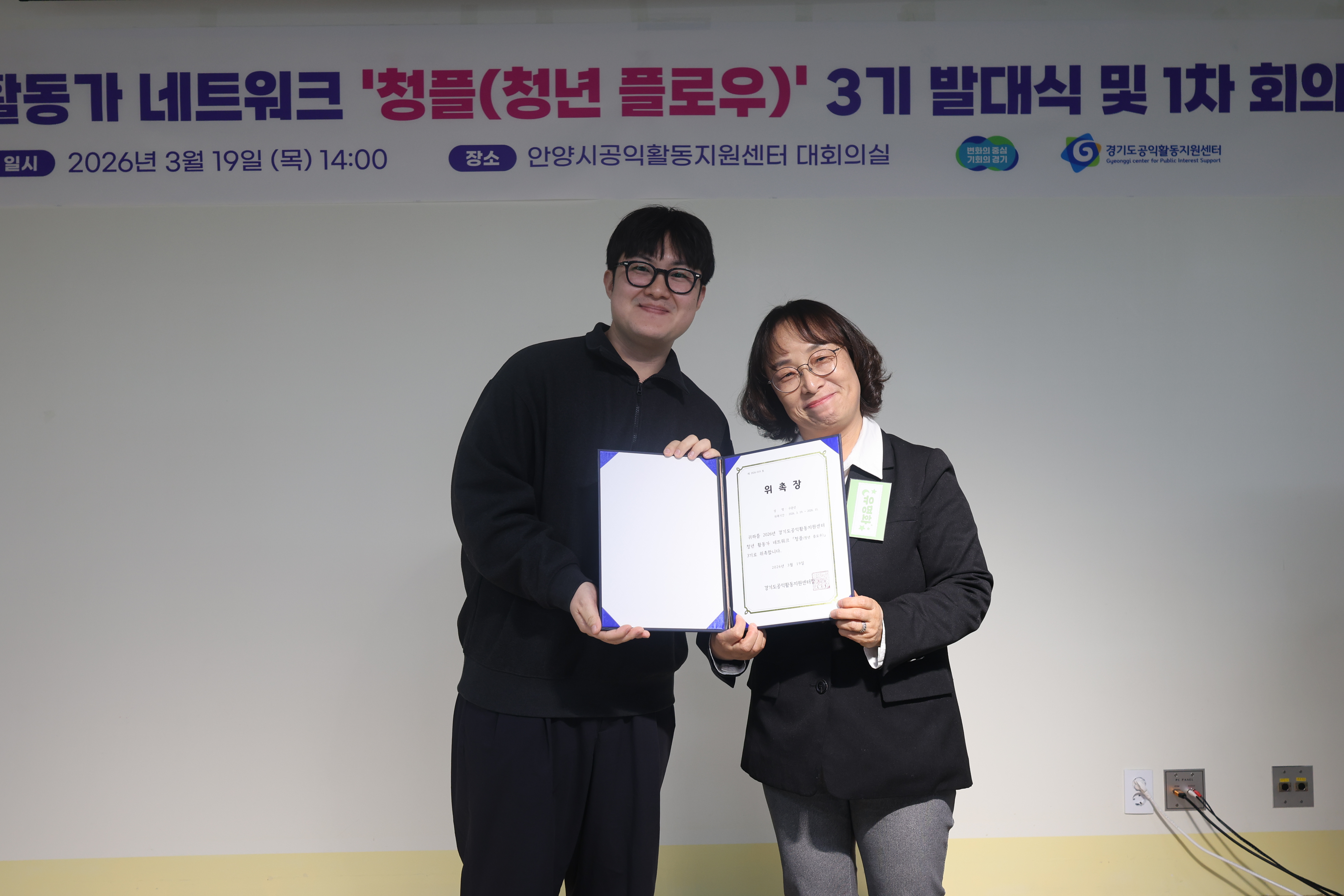 2026년 3월 19일, 안양시공익활동지원센터 대회의실에서 청년 활동가 네트워크 ‘청플(청년 플로우)’ 3기 발대식과 1차 회의가 열렸습니다. 이날 자리는 청년 활동가 15명이 처음으로 한자리에 모여 서로를 소개하고, 앞으로 어떤 흐름을 함께 만들어갈지 이야기해 보는 시간이었습니다. 가장 먼저 청플 3기를 환영하는 유명화 경기도공익활동지원센터장의 환영사가 있었습니다.