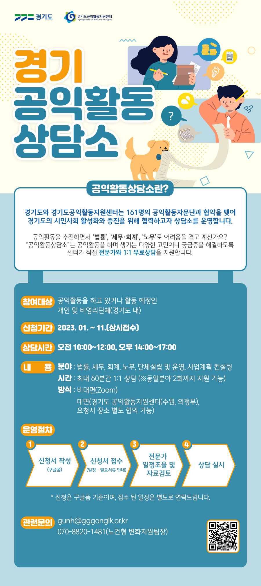 - 공익활동 중 발생하는 고민을 해결할 수 있도록 각 분야의 전문가와 1:1상담 지원