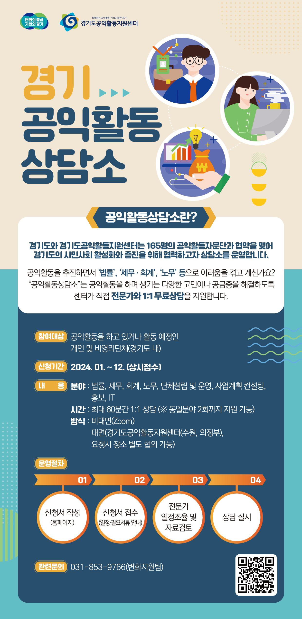 - 공익활동 중 발생하는 고민을 해결할 수 있도록 각 분야의 전문가와 1:1상담 지원