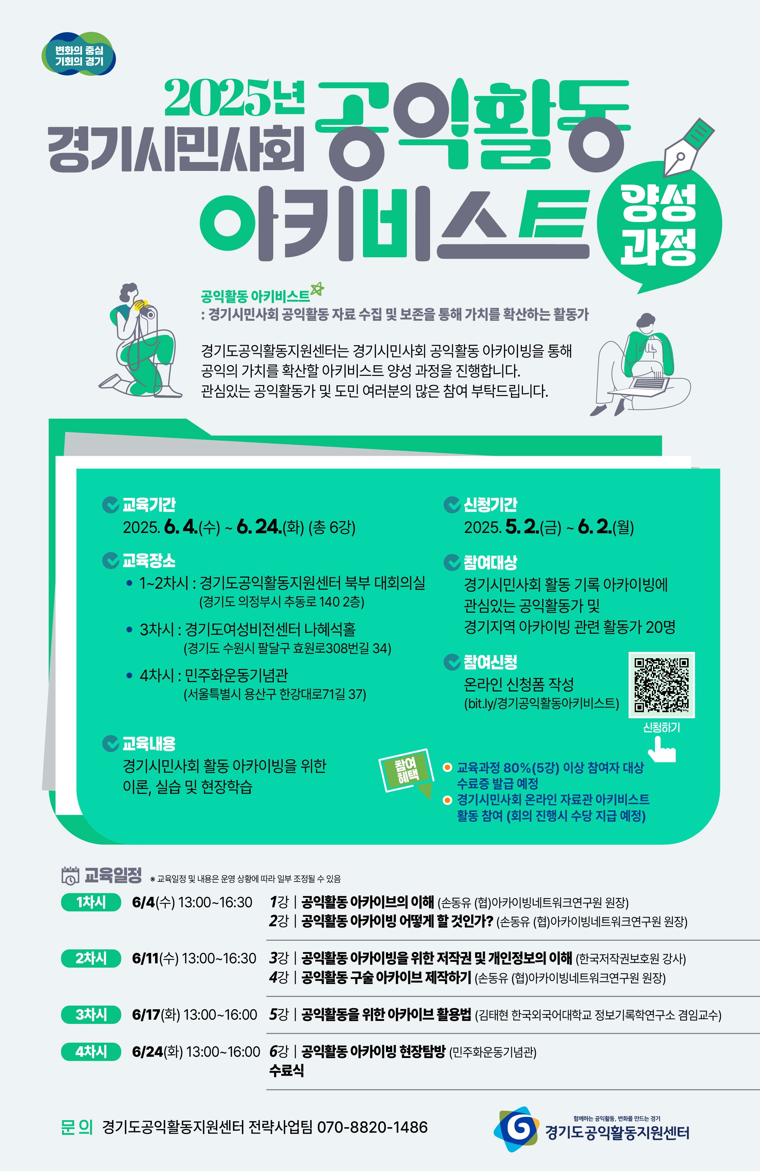 붙임1. 센터 아카이브 에디터 5기 모집 웹자보.jpg 붙임2. 경기도 공익활 동시민기록자 양성교육(입문과정) 웹자보.jpg 붙임3. 경기도 공익활동 시민기록자 양성교육(심화과정) 웹자보.jpg 붙임4. 2025년 경기시민사회 공익활동 아키비스트 양성과정 참여자 모집 웹자보.jpg