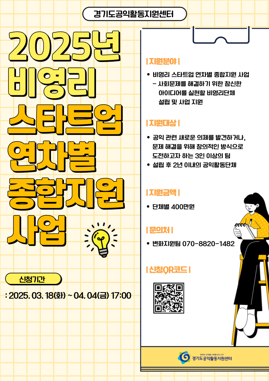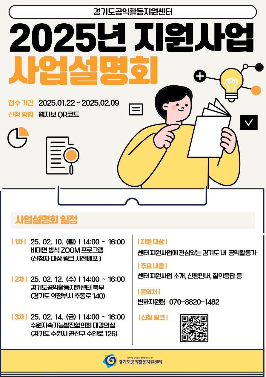 붙임1. 2025년 센터 지원사업 사업설명회 웹자보.jpg 붙임2. 2025년 공익활동단체 지원사업 공고 웹자보.png 붙임3. 2025년 비영리스타트업 연차별 종합지원사업 모집 웹자보.jpg