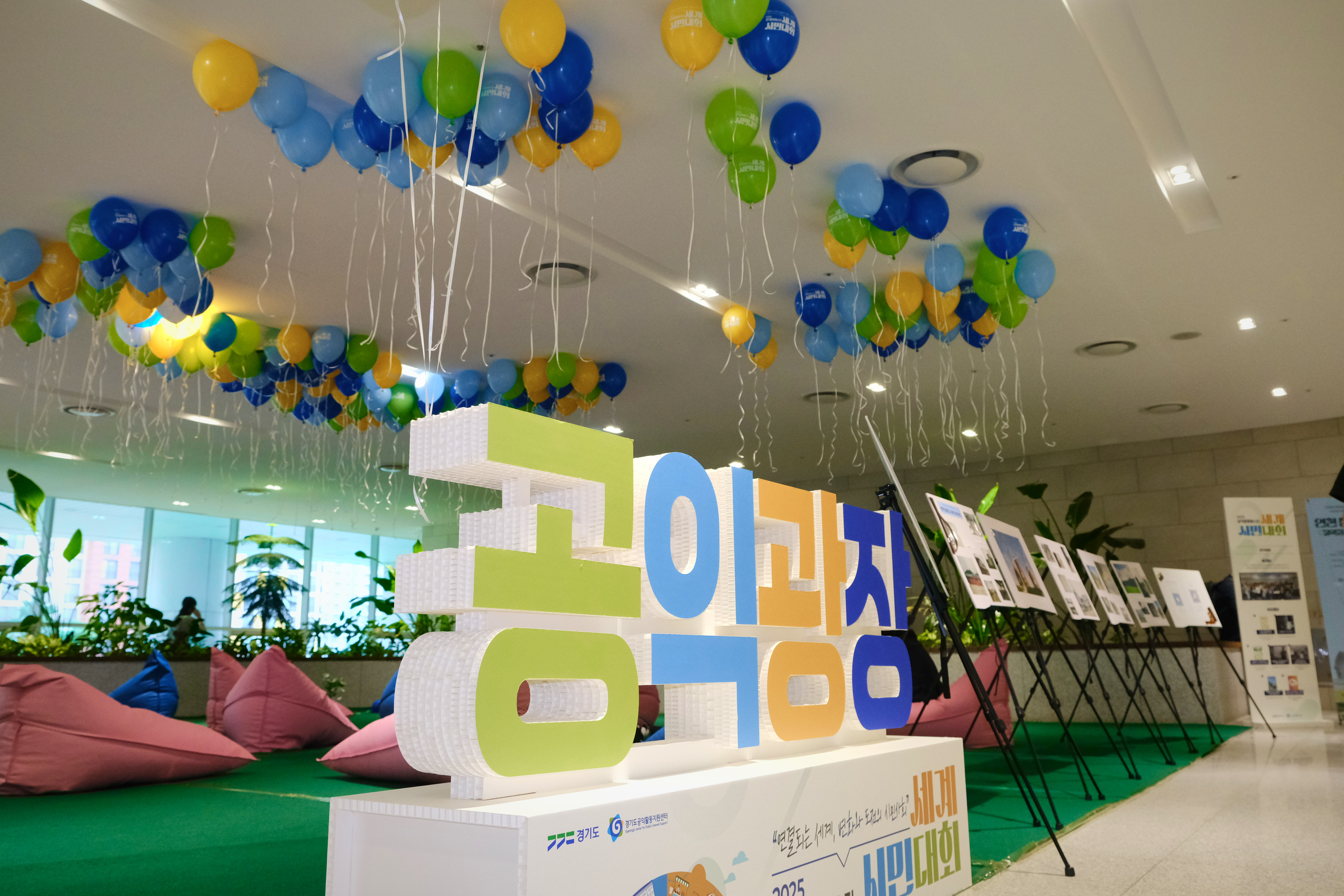 수원 컨벤션센터 4층 계단을 오르면 바로 앞에 ‘공익광장’이 방문객을 맞았습니다. 넓은 로비 천장엔 알록달록 풍선이 떠 있고 바닥엔 말랑말랑한 컬러 소파가 가득하죠. 세계시민대회를 알리는 현수막과 지역의 공익활동을 보여주는 사진을 둘러보며 방문객은 안내데스크로 연결될 수 있었습니다. 넓은 창가엔 차탁과 의자 그리고 다과가 준비돼 있어 누구나 무료로 이용할 수 있었죠. ‘공익광장’을 걸어 컨퍼런스 홀로 가는 길목에서 대형 현수막이 말을 걸었습니다.