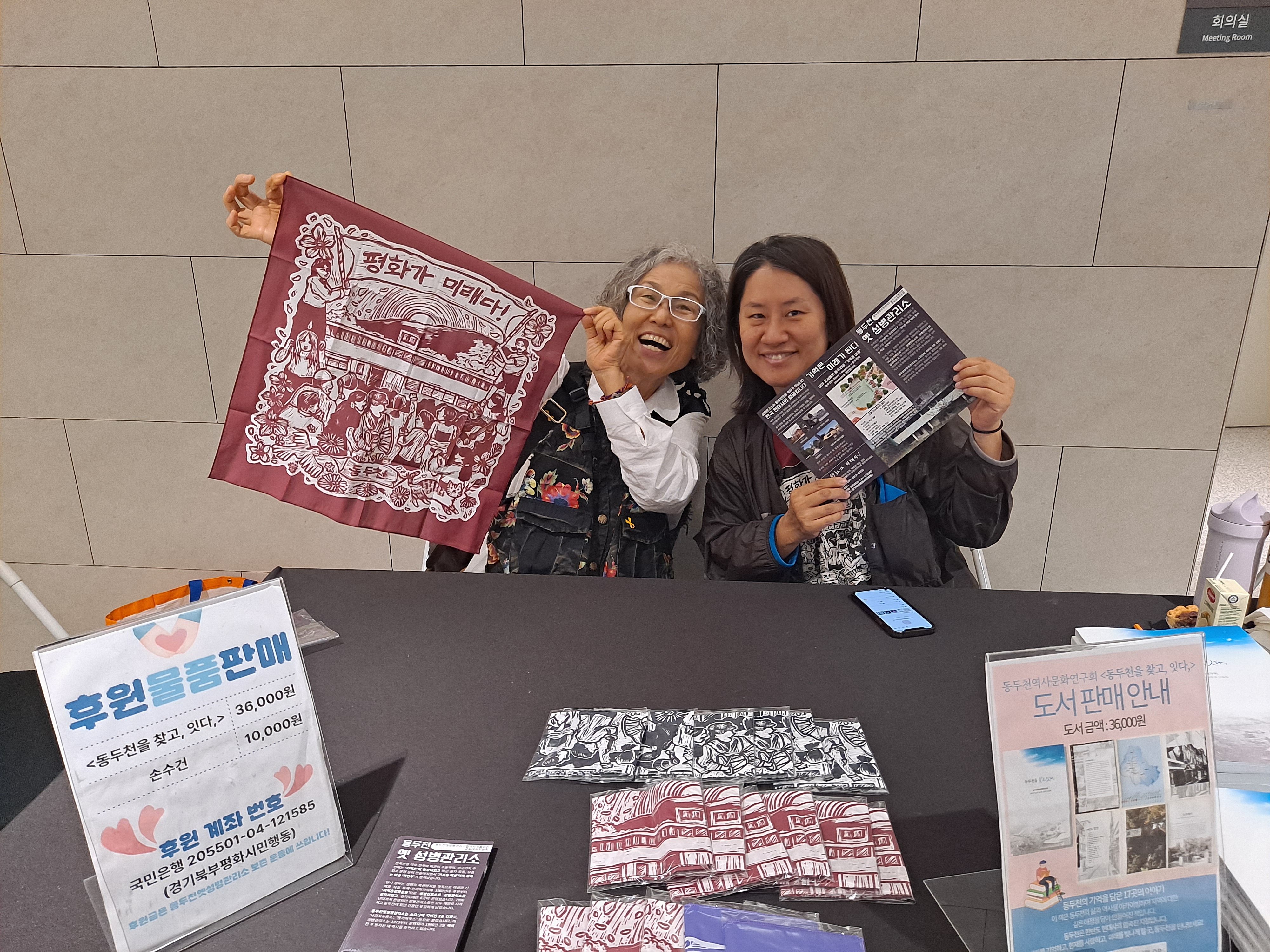 복도에 책상 하나 놓고 홍보하는 ‘동두천 옛 성병관리소 보존운동’ 활동가들도 만날 수 있었습니다. 성병관리소 홍보 자료와 함께 크고 무거운 책 『동두천을 찾고, 잇다,』(36,000원)와 “평화가 미래다” 손수건(10,000원)을 팔고 있었습니다. 활동가님들과 인사하고 이야기한 후 “평화가 미래다”에 연대하는 맘으로 책과 손수건을 샀습니다. 이 무거운 책을 펴낸 ‘동두천역사문화연구회’는 2020년 5월에 설립된 작은 동아리라네요. 동두천에서 태어났거나 오래 살고 있는 5명의 동두천 사람들이 지역의 역사와 문화를 사랑하고 공부하며 탐방한 결과물이랍니다.