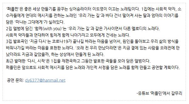 기조강연 후 그 자리에 도시락 점심이 제공되더니 무대에서 한 사람이 노래를 하더군요. 특별공연이라네요. 수수한 셔츠 차림의 중년 여성의 목소리가 참 맑았습니다. 공익활동가들을 지지하고 위로하는 가사가 들렸어요. 그러고 보니 어디선가 공익활동 행사에서 본 듯해서 저는 눈과 귀를 뗄 수 없었습니다. 3곡을 부르고 자리를 뜨는 그분을 알고 싶어서 후다닥 따라갔죠. 인사하고 다짜고짜 인터뷰를 요청했습니다. “연결되는 세계, 변화와 도전의 시민사회”, 그런 연결이자 특별한 만남이 이루어졌습니다. 싱어송라이터 퍼플민 이도영 님과의 일문일답입니다.