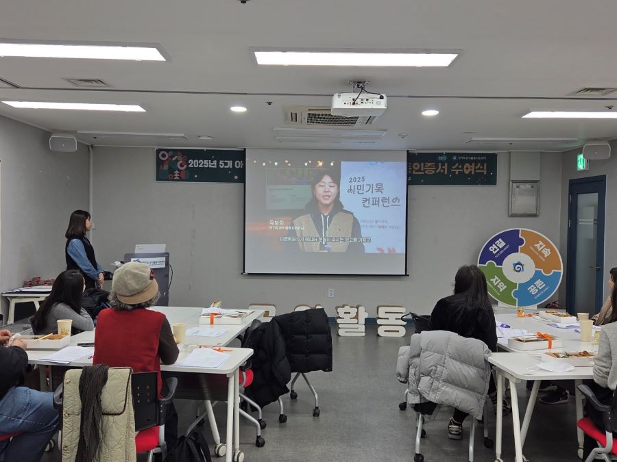 수료식에 앞서 정선미 경기도공익활동지원센터 운영총괄실장께서 인사말을 해주셨습니다. 11월에 진행된 2025 시민 기록 컨퍼런스 예시를 들며 포문을 열었는데요. 당시 체험 부스에 시민들도 같이 참여하는 모습을 보며 인상 깊었던 것처럼 에디터의 ‘공익’ 매개 역할의 의미에 대해 들여다보게 됐다고 밝혔습니다. 또한 글 솜씨보다 가치관이 더욱 주목받는 시간을 마련했다는 점에 큰 의의를 두었습니다.