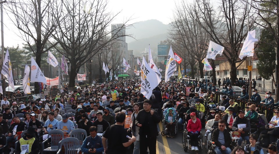 그래서 전국장애인차별철폐연대(이하 ‘전장연’)는 4월 20일을 ‘장애인의 날’이 아니라 ‘장애인 차별 철폐의 날’이라 불러요. 시혜적 성격을 거부하고, 이동권, 탈시설, 교육 등 장애인 권리 쟁취를 위해 투쟁하는 날이죠. 올해도 3월 26일에 청와대 앞에서 <22회 3.26 전국장애인대회 및 4.20 장애인차별철폐공동투쟁단 출범식>을 열었어요. 최옥란 열사 기일에 열린 22회 3.26 대회였죠. 효자동 복지센터 인근에서 출발해서 광화문 광장까지 행진하고 집회와 열사들을 기리는 추모제도 진행했어요. 많은 활동가들이 각자 다른 이야기를 가지고 전국에서 모여요.