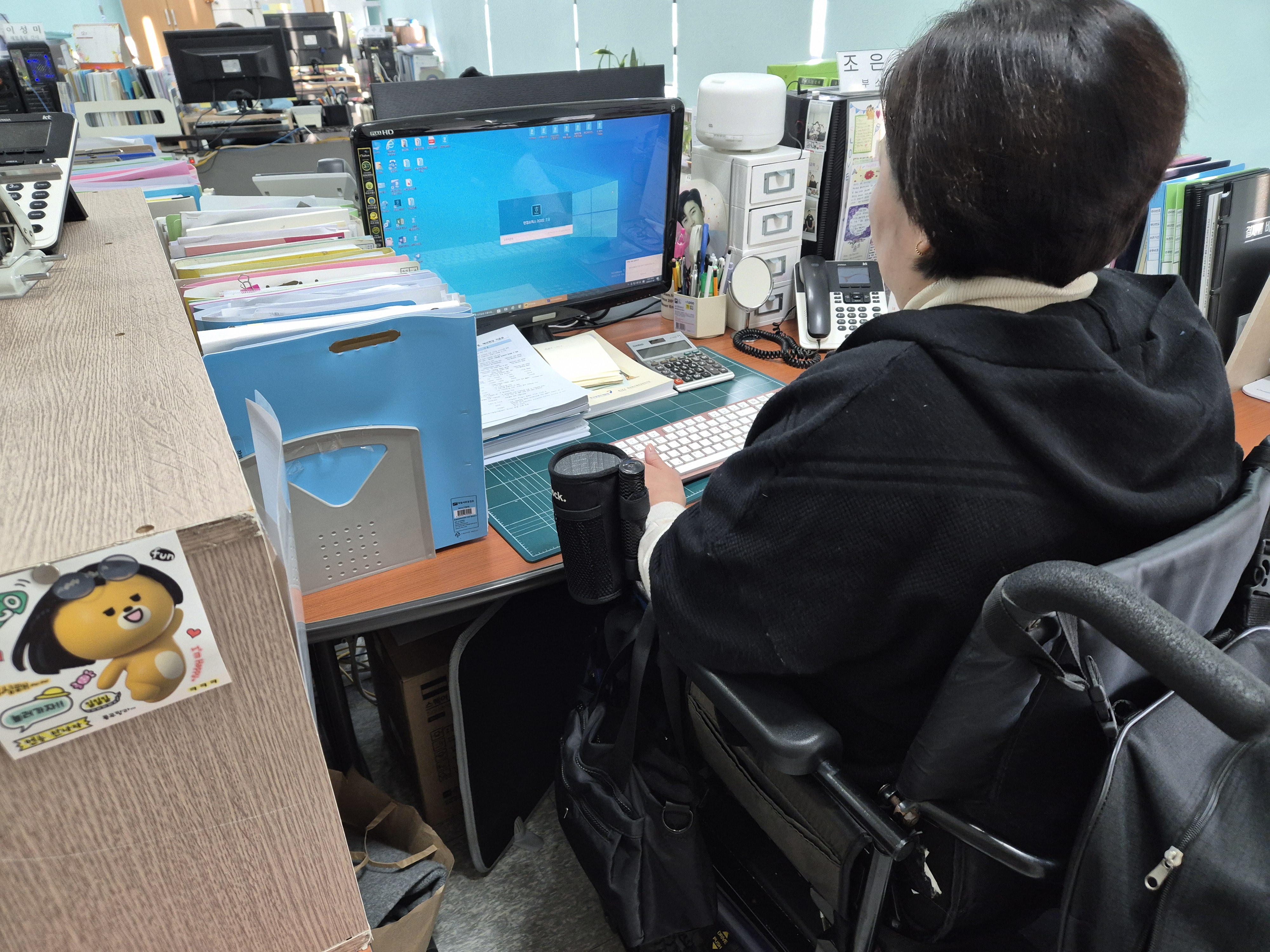 상록수장애인자립생활지원센터 사무실 책상 앞에서 사진제공 조은상