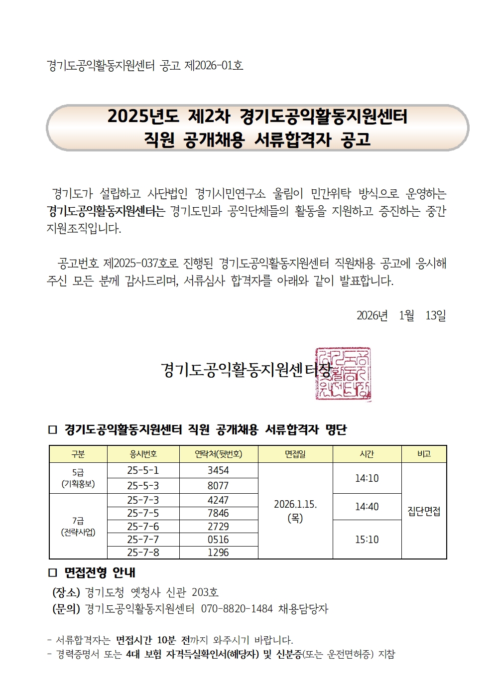 2025년 제2차 경기도공익활동지원센터 직원공개채용 서류합격자 공고