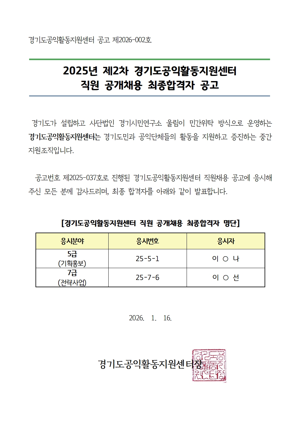 2025년 제2차 경기도공익활동지원센터 직원공개채용 최종합격 공고