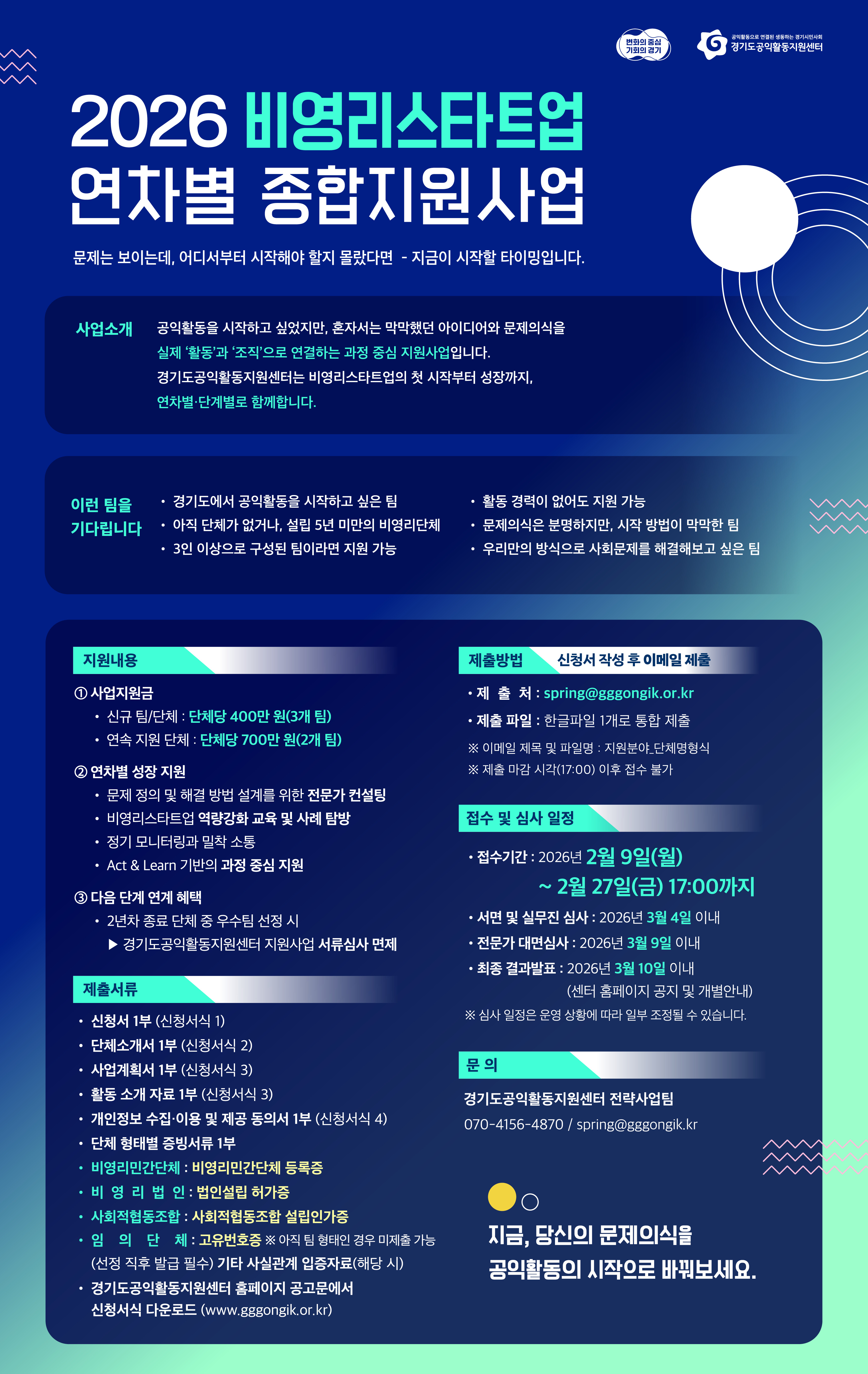 경기도공익활동지원센터는 공익활동의 새로운 주체 발굴 및 다양한 생태계 조성을 위한 2026년 「비영리 스타트업 연차별 종합지원사업」 시행을 아래와 같이 공고합니다.