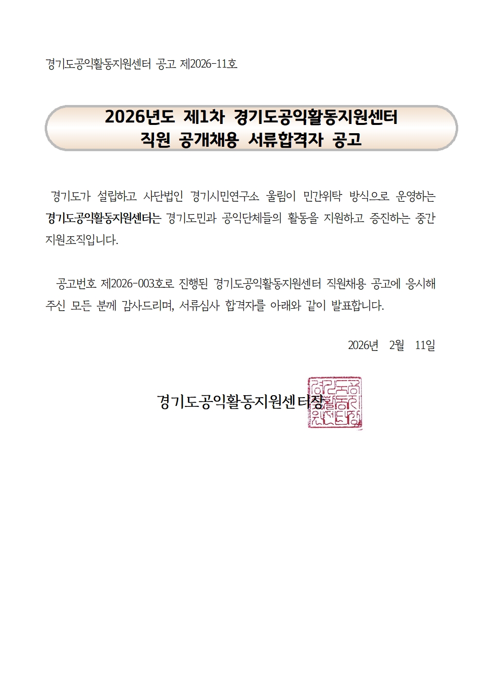 26년 제1차 직원 공개채용 서류합격자 공고문
