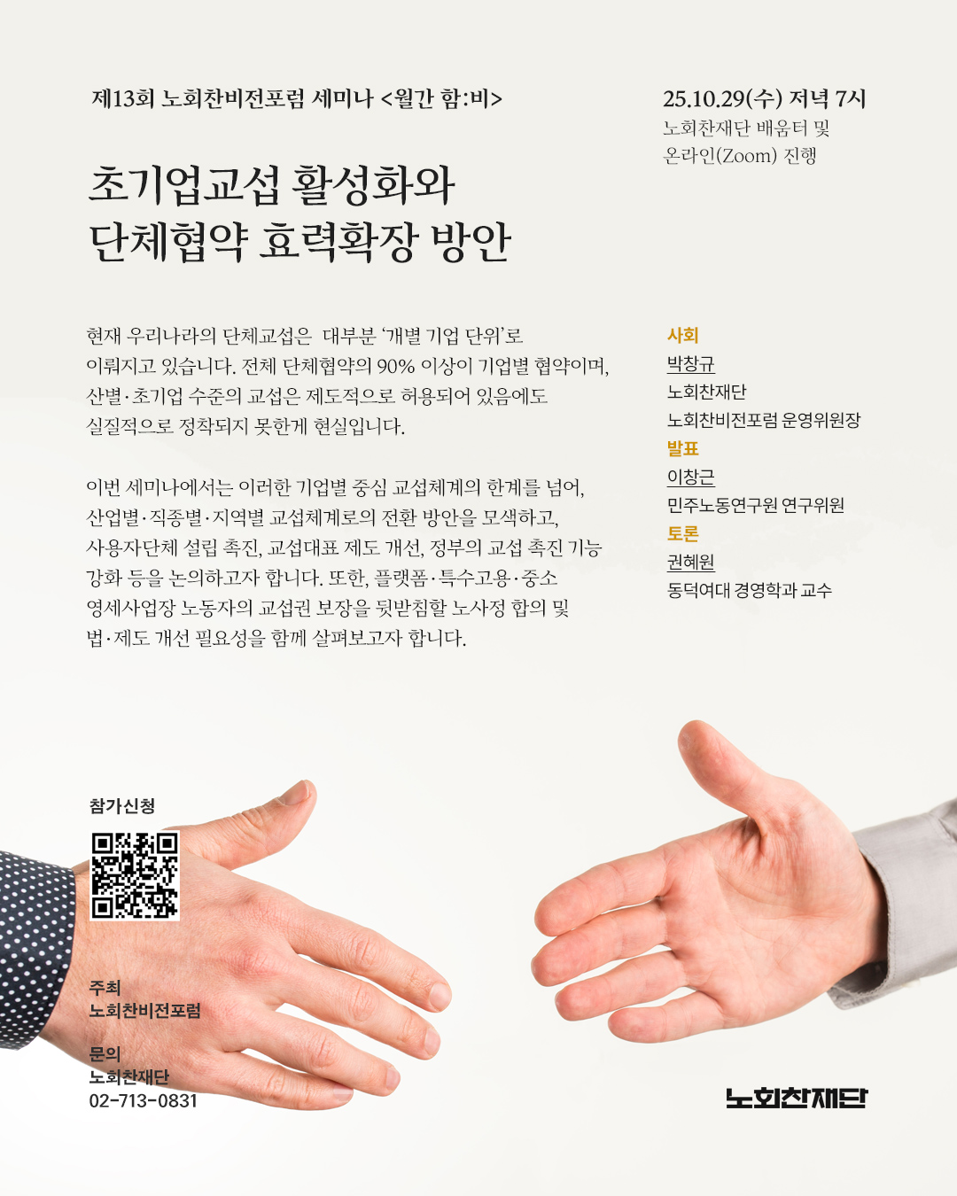 이번 세미나에서는 이러한 기업별 중심 교섭체계의 한계를 넘어, 산업별·직종별·지역별 교섭체계로의 전환 방안을 모색하고, 사용자단체 설립 촉진, 교섭대표 제도 개선, 정부의 교섭 촉진 기능 강화 등을 논의하고자 합니다. 또한, 플랫폼·특수고용·중소 영세사업장 노동자의 교섭권 보장을 뒷받침할 노사정 합의 및 법·제도 개선 필요성을 함께 살펴보고자 합니다. 많은 관심과 참여를 부탁드립니다.