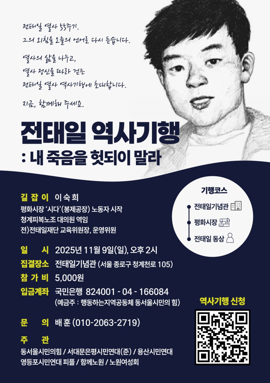새롭게 듣는 전태일 열사의 삶, 그리고 그 정신을 따라 함께 걷는 역사기행에 여러분을 초대합니다.
