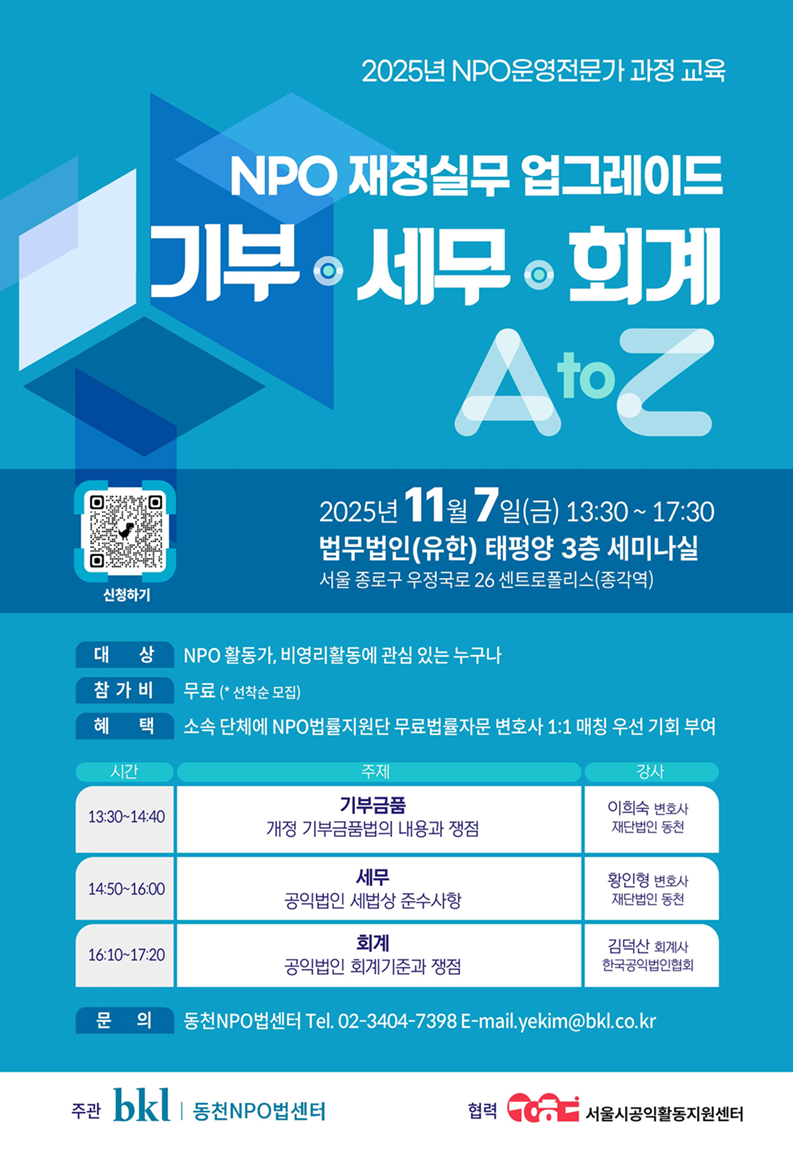 이번 교육은 NPO실무자들이 개정 법령과 세법·회계기준을 숙지하여 공익사업을 적법하게 수행할 수 있도록 돕기 위해 마련되었습니다.