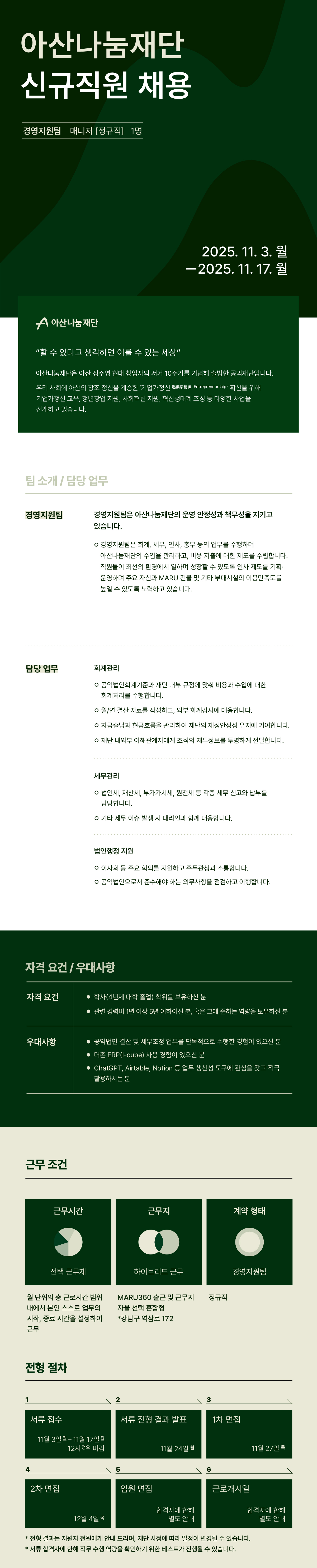 ※문의처: 아산나눔재단 경영지원팀 (recruit@asan-nanum.org)