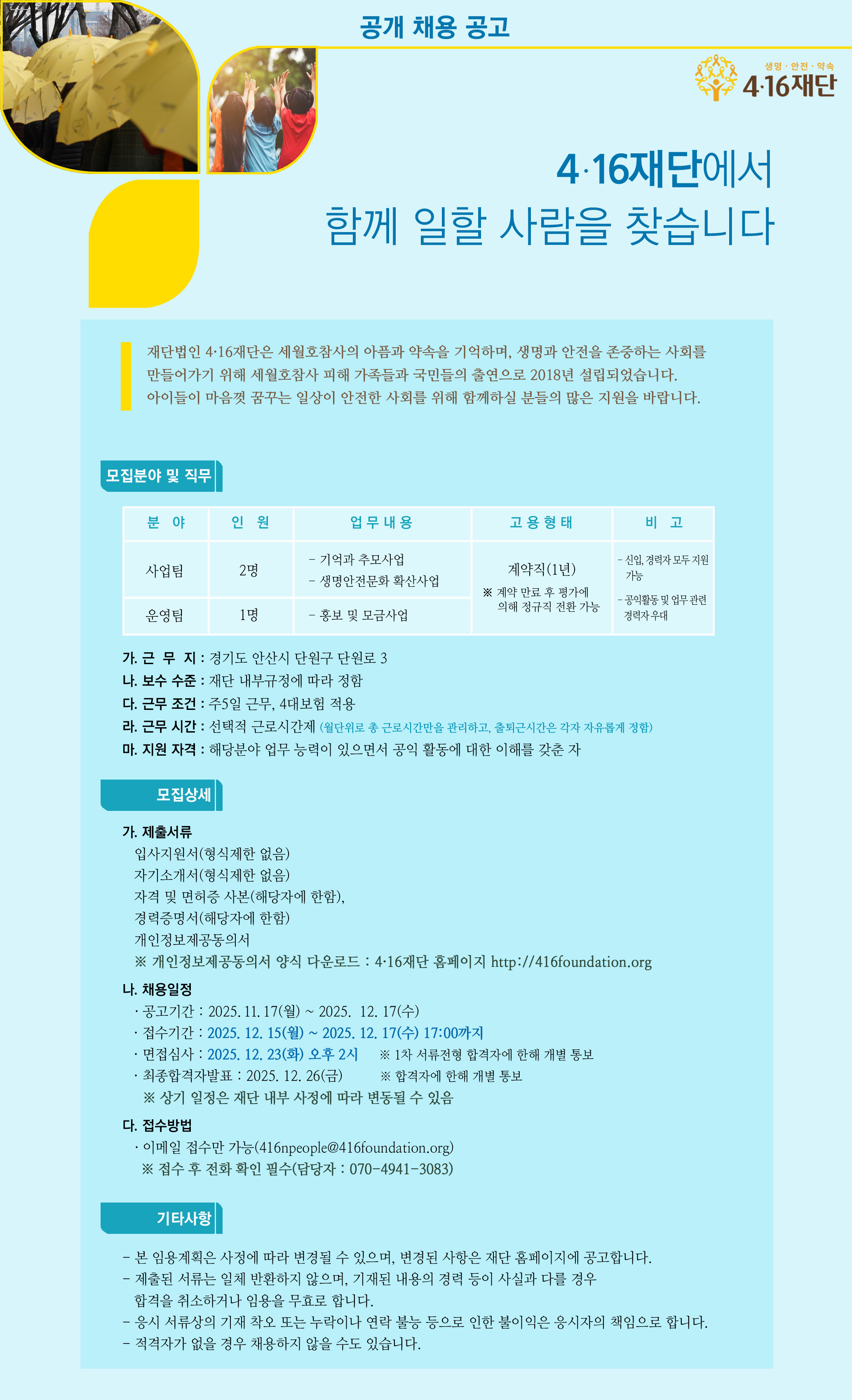 - 사업팀 : 2명 모집, 기억과 추모사업 / 생명안전문화 확산사업