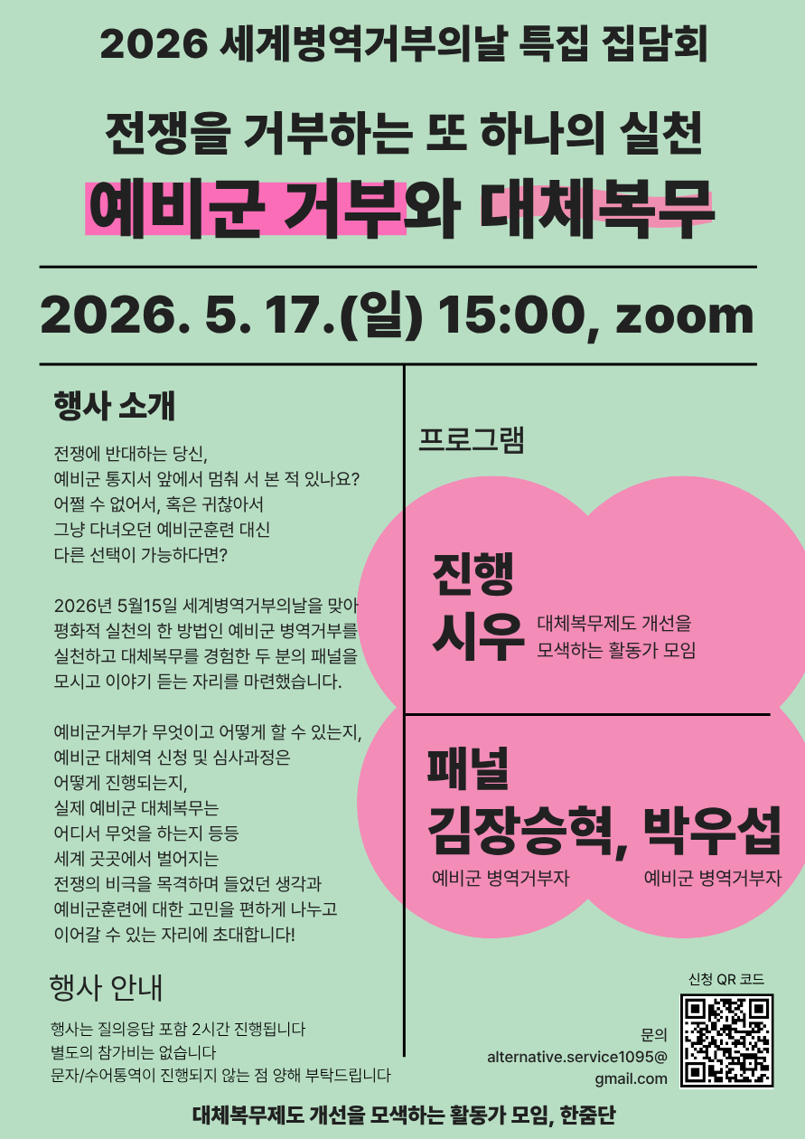 2026년 5월15일 세계병역거부의날을 맞아 평화적 실천의 한 방법인 예비군 병역거부를 실천하고 대체복무를 경험한 두 분의 패널을 모시고 이야기 듣는 자리를 마련했습니다.